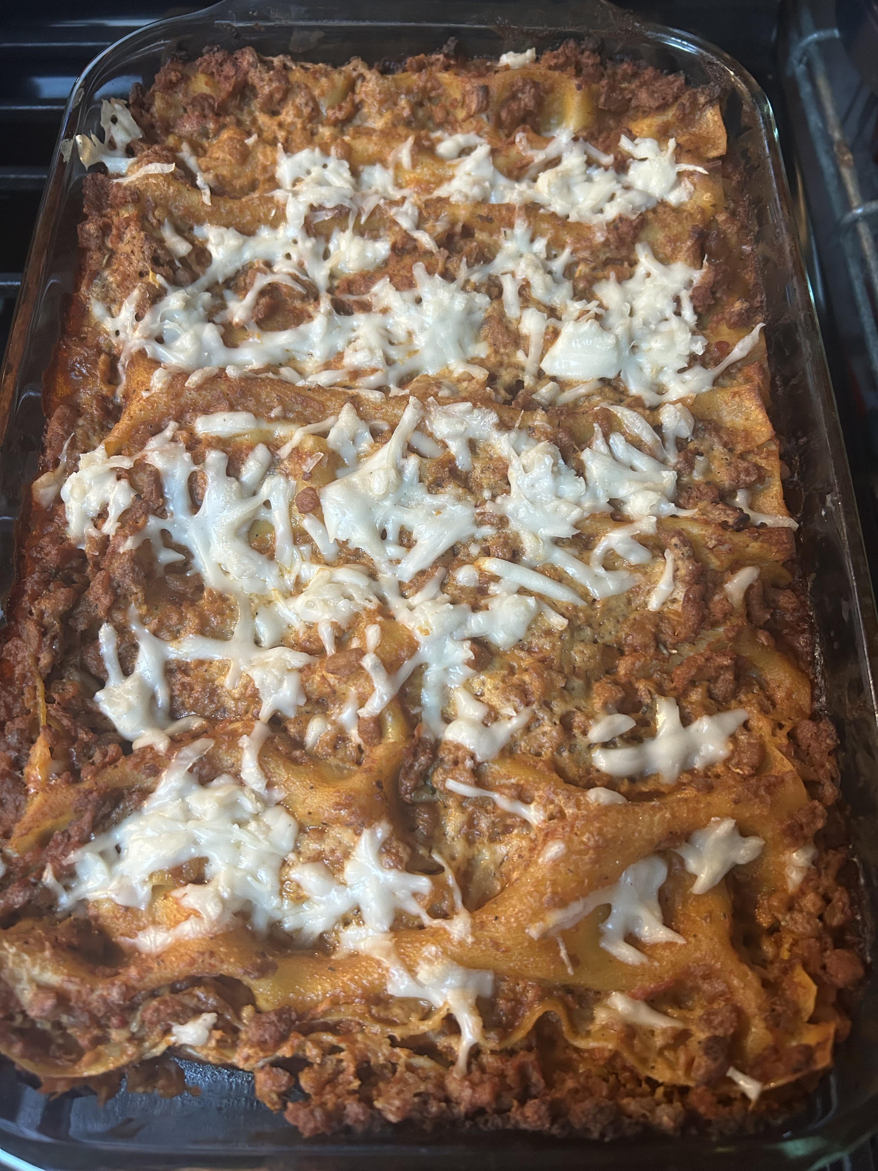 Once done, layer the bottom of your baking dish with some of the meat sauce mixture, layer noodles on top followed by meat sauce, Béchamel, mozzarella, noodles for as many layers as you’d like. Mine ended up being 4 layers. When you get to your top layer, add meat sauce and Béchamel, cover with foil and bake for 45-60 minutes at 400 if using no boil noodles. Your baking time is going to need to be adjusted based on your oven and if your noodles are no-boil or boiled. Once your lasagna is cooked through, remove foil, add shredded mozzarella to top and bake or broil for an additional 5-10 minutes until cheese is melted.
