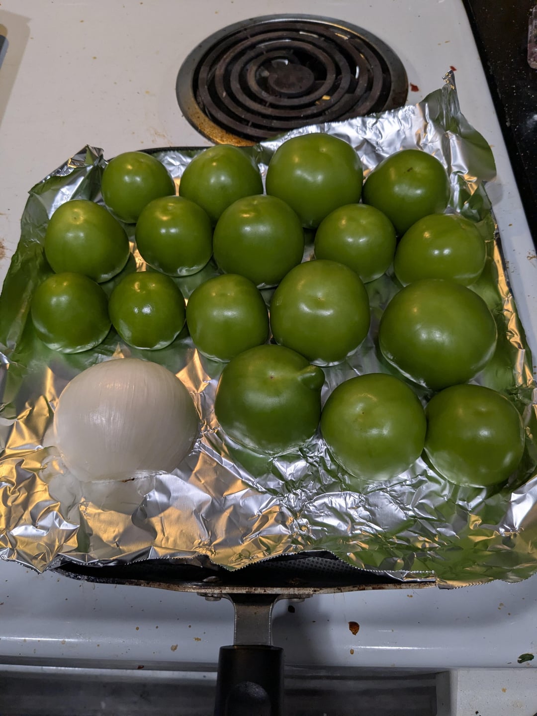 Roasted: 17 tomatillos, half a white onion, 25 chiles de árbol, and 5 garlic cloves