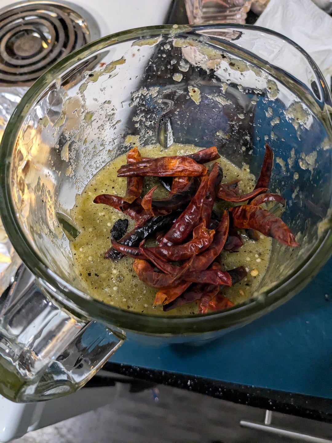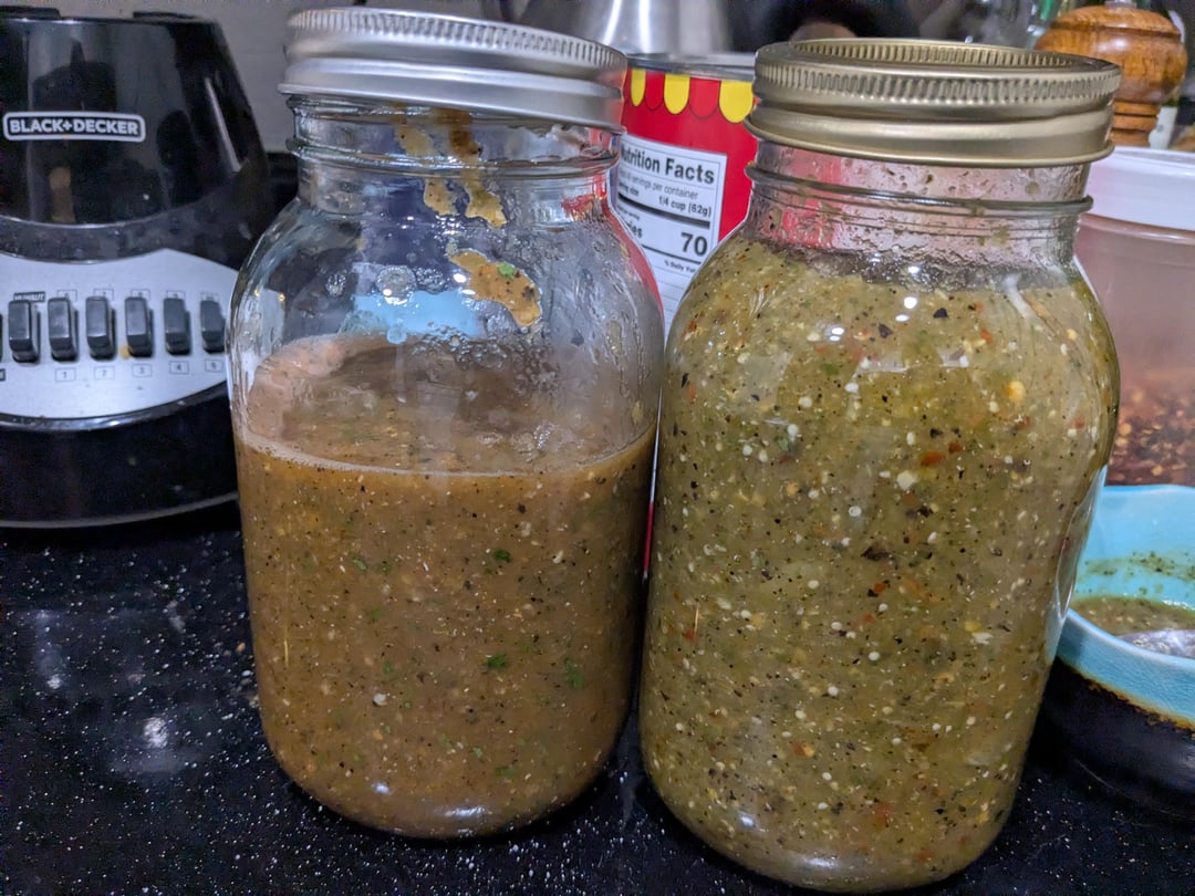 kategask 7 days ago First (jar on the right):Roasted: 17 tomatillos, half a white onion, 25 chiles de árbol, and 5 garlic clovesRaw: 1 bunch of cilantro, salt, pinch of pepper, and the tiniest pinch of cuminSecond (jaw on the left):Roasted: 5 roma tomatoes, 9 serranos. half a white onion, 4 garlic clovesRaw: a bunch of cilantro, salt, pinch of pepper, pinch of sugar, and a tiny pinch of cumin