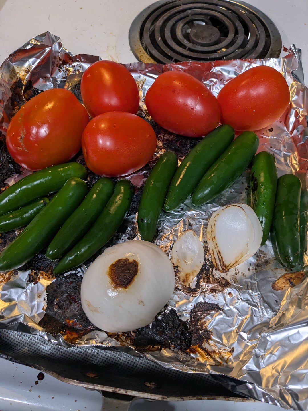 Roasted: 5 roma tomatoes, 9 serranos. half a white onion, 4 garlic cloves