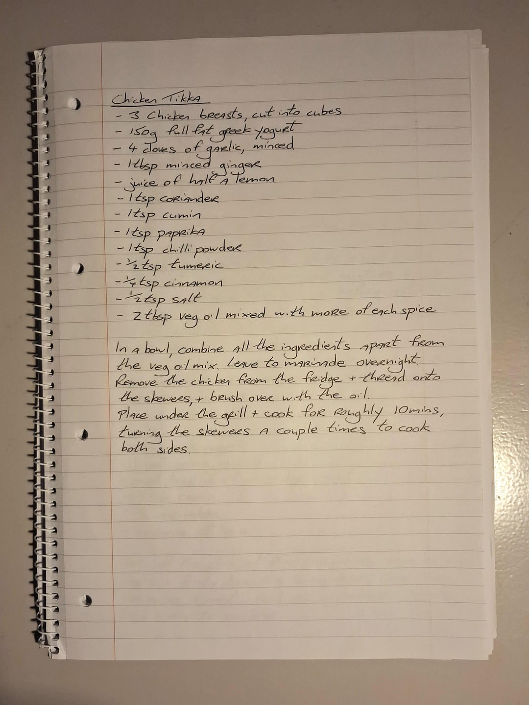 I made chicken tikka kebabs for dinnerby Artlistra 18 Comments Remarkable_Quail2731 6 months ago Thank you for the recipe Layllah_ 6 months ago Delicious! Thank you for the recipe! subtle_temptation 6 months ago Looks absolutely delicious. Thank you for sharing your recipe. BreakfastPizzaStudio 6 months ago Looks insanely good. Saving this for the recipe. Thank you! Nickthegreek28 6 months ago Unreal such a talent ServiceFinal952 6 months ago Wow this looks incredible! Good job, OP! krispy1203 6 months ago thanks so much for the recipe! i’m going to try this yum ttrockwood 6 months ago Haha you must be gen x or millennial with that beautiful hand writing! National_West_8604 6 months ago Amazing! And posted recipe! OP you win! Friendly_River2465 6 months ago Yummy Different-Meat-8562 6 months ago Delicious Enough-Cranberry5616 6 months ago Thanks for sharing the recipes! Looks delicious Dusty_Old_McCormick 6 months ago Perfection! Kgcampbell 6 months ago Oh my goodness this looks amazing! I just saved the recipe to make this. Thank you so much! jmj24302 6 months ago Looks great, would definitely love a plate🤭 chandler-bingaling 6 months ago looks amazing Jhardo314 6 months ago Idk what looks better. Penmanship or food 😍 nmo-320 6 months ago Yummy!!!