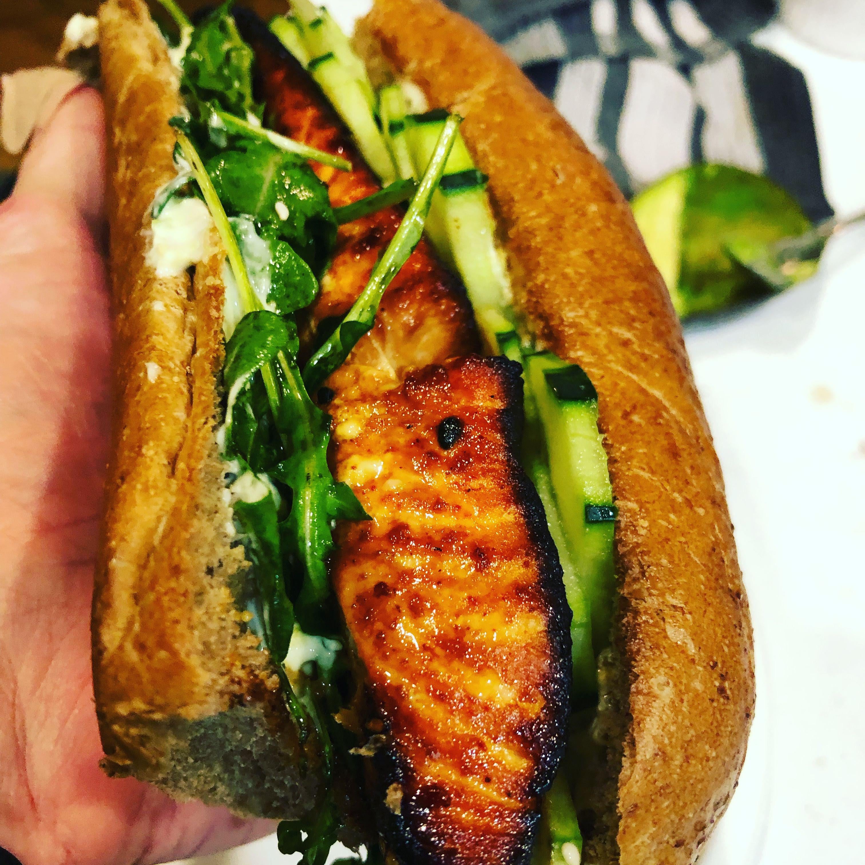 Faroe Island Salmon I marinated in gochujang (store bought), broiled, and sprinkled with sesame seeds. Mixed together some mayo, wasabi paste, and lemon juice together then folded in some diced avocado, spread liberally on toasted bun. Tossed baby arugula with sesame oil and soy. Thinly sliced some cucumbers and stuffed it all inside a heart healthy whole wheat bun.