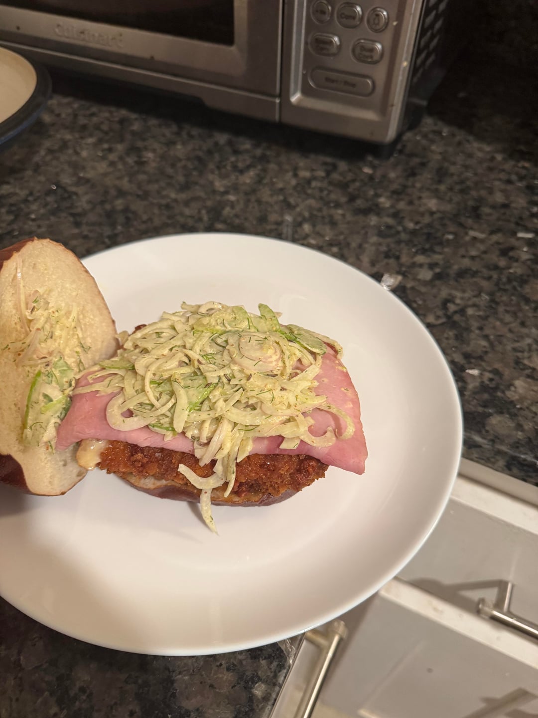 Pretzel bun, homemade apple butter, large fried block of panko-breaded Muenster, slice of ham, and a slaw of fennel-shallot-celery-mustard-caraway by JanePeaches 4 Comments GooseMayne 5 months ago This is blowing my mind Tatted_Ninja_Wizard 5 months ago No money shot?? rasputinology 5 months ago Good pot out there, I take it? snacksandshit 5 months ago Obviously the cross-section is a glaring omission, but this is good shit right here.