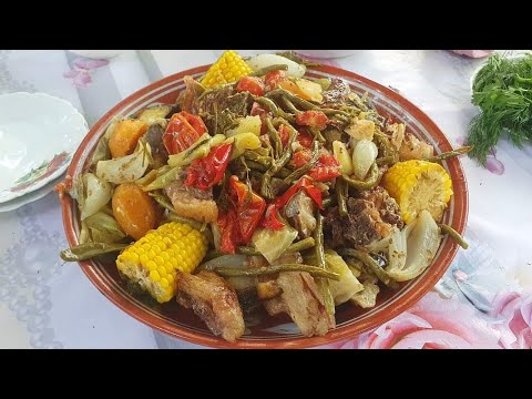 на басма или дымлама. Что такое басма и что есть дымлама? Оба эти слова имеют абсолютно узбеские корни. Ммлома от узбекого димлемок, что означает тушить в кулинарном смысле. То есть сначала обжарить, а потом, добавив жидкость, медленно томить. Боссы слово, обозначающее давление парам. Ну, я думаю, разобрались. Значит, если вы сначала обжариваете компоненты, а потом в процессе сгущения доводите до готовности, то вы готовите диломо. А если вы укладываете все компоненты сырыми в казан плотно-преплотно и закрываете крышки и таким образом выдерживаете на малом огне, значит, делаете басму. Но басма редко употребляемое название, распространённое лишь в отдельных областях Узбекистана. В большинстве случаев, вне зависимости от того, готовят ли с предварительной обжалоркой или без неё, еду называют демломой. Но мы с вами будем говорить правильно и разделять эти два прекрасных узбекских взгляда в зависимости от технологии приготовления. Для меня дымлама одна из самых удачных сочетаний большого количества овощей и мяса. Набор овощей может меняться в зависимости от сезона. Кто-то добавляет и баклажаны, и кабачки, и кукурузу. Но одно остаётся неизменным. В этом блюде каждый найдёт то, что ему по вкусу. Обратите внимание, да, как зелень была вся нарезана, потому что лук болгарский, он в ноль уходит до мамы. Смысл? Тут всё перемешали зеленью и слоями дали. Повторюсь, можно добавить баклажаны, айву. те же стебли сельдерея, кукурузу, но это должно быть нарезано достаточно крупно и выкладывается слоями между мясой и картошкой. А если вообще рассмотреть, это овощное рагу. И такое блюдо есть во всех странах. И данное блюдо, оно называется по-разному. Но, говоря по-русски, это овощное рого, приготовленное в казастре в казане, на огне методом томления. То есть всё тушится в зависимости от качества мяса. От часа до 2 часов всё тушится аккуратно и целиком остаются крупные куски мяса. И вот картошка, вы увидите. Ну и как украшение вот этот свежий чеснок. Всё остальное, все остальные овощи, конечно, в ноль уходят томаты, лук, палгарский, зелень, это всё уходит ноль. Ну и остаётся вот капуста, кукуруза. Кукуруза быстро молочная, она сверху сва сверху заложится, сварится быстро, потом откроют крышку до лужи, до конца. Вот так вот готовит классическую домламу в чайнах Ташкента. Вкусного плова и вкусной домламы всем нам. Делитесь с друзьями, приготовьте, напишите в комментариях, пожалуйста, поставьте лайк, подпишитесь, комментарий. Ну, сами знаете. Спасибо. Ну, и вкусного плова нам всем.