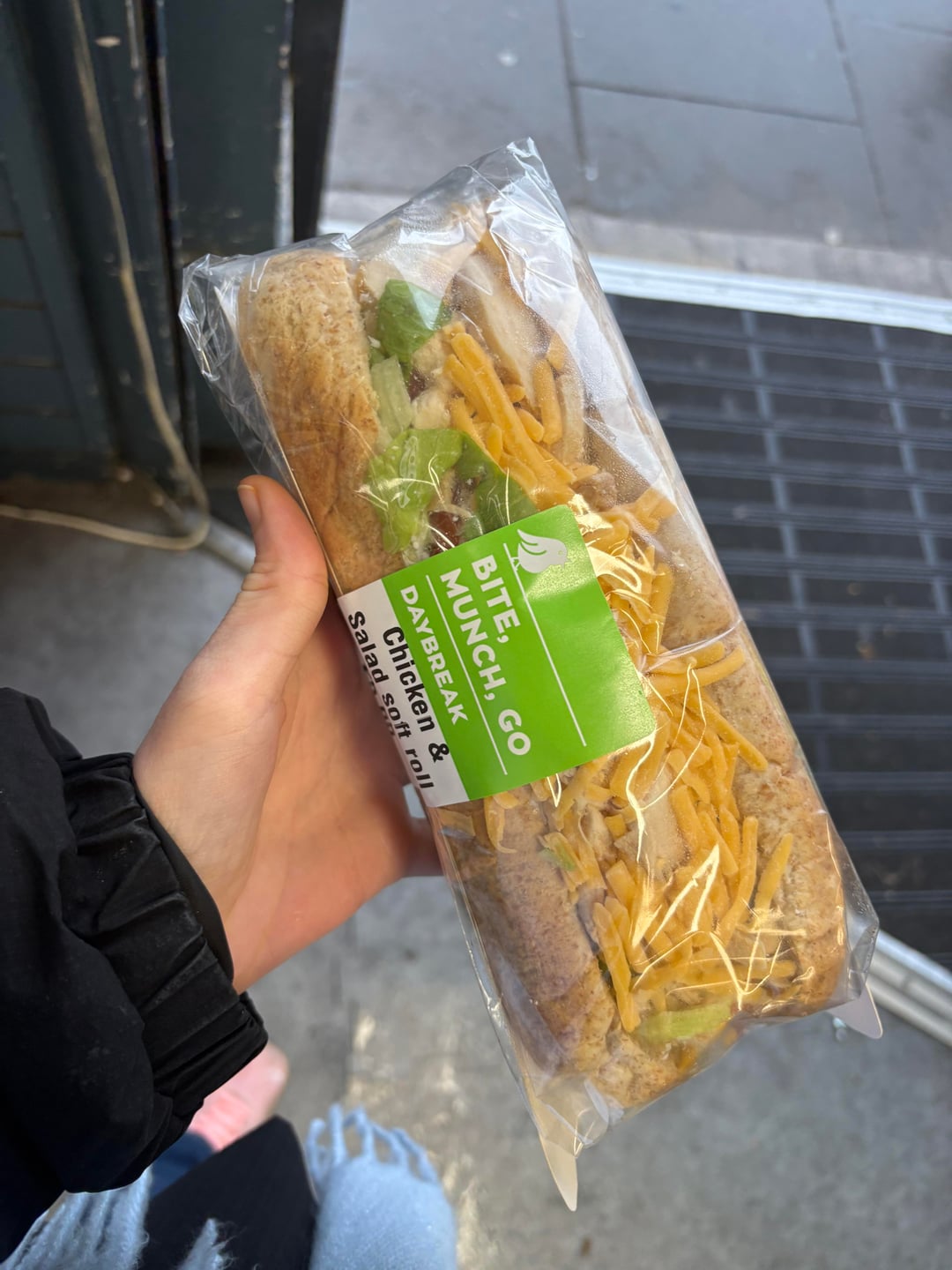 Massive soft roll with chicken, lettuce, tomato, mayo and cheese
