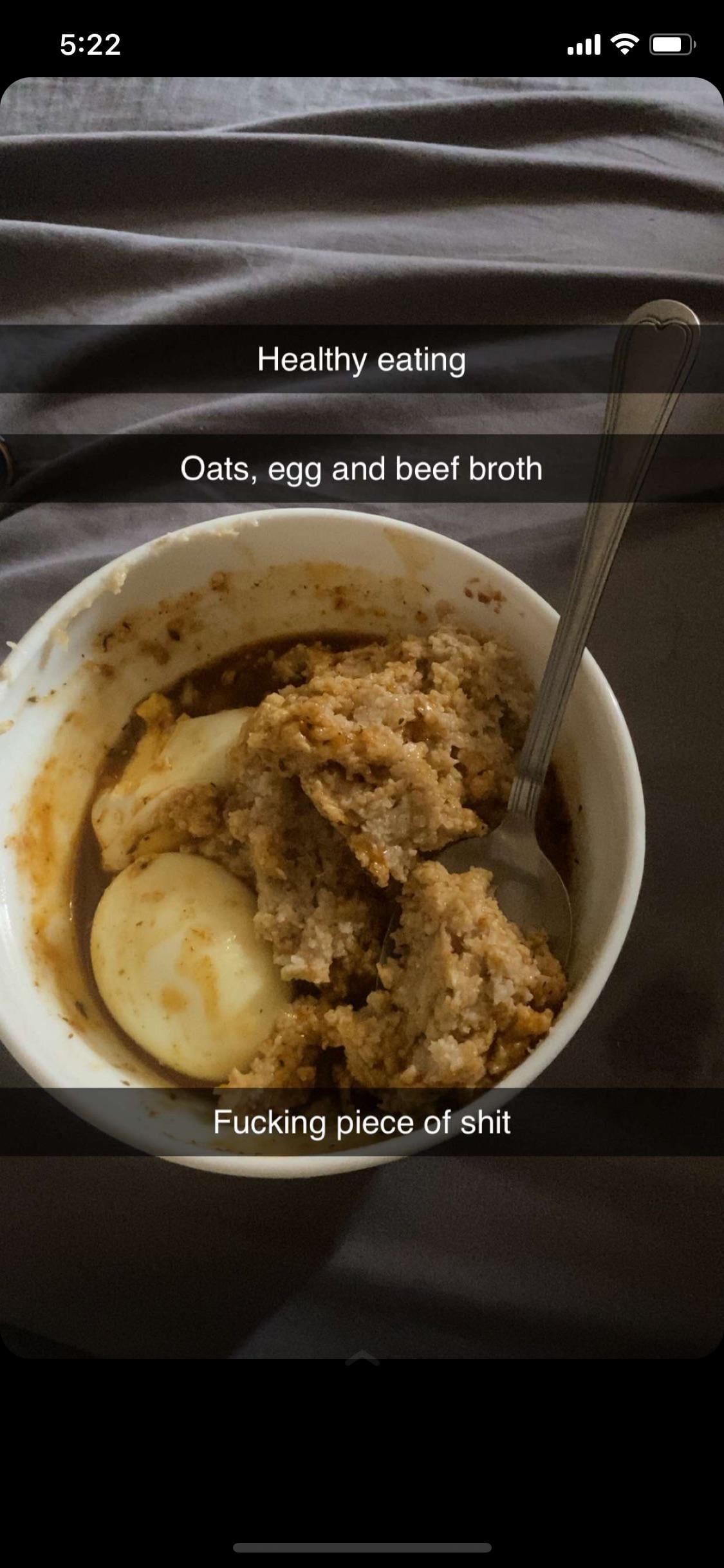 I see what your doing with this meal OP and itβs got potential to be not stupid food. Take a look into savoury oats or rice and oats.