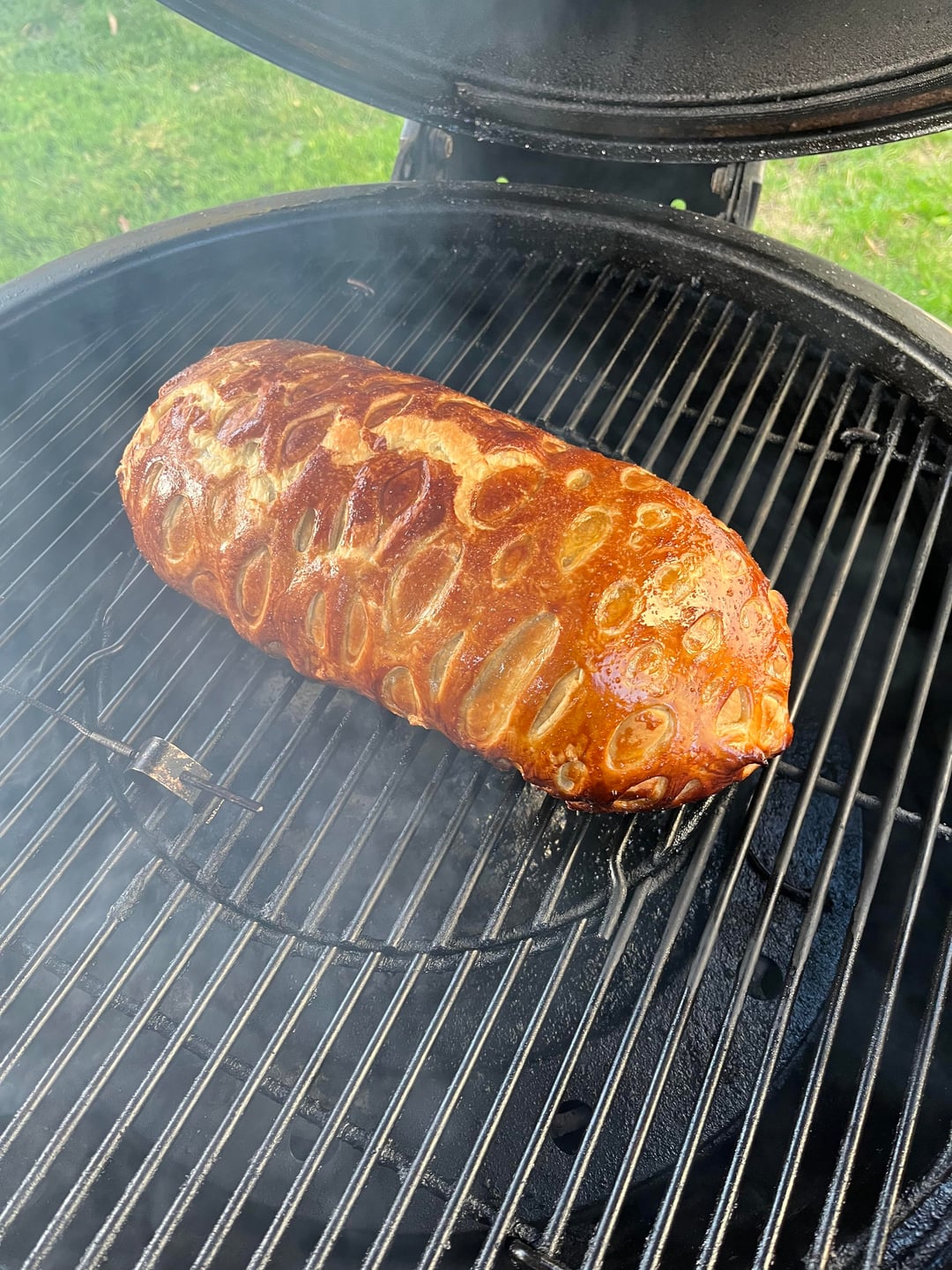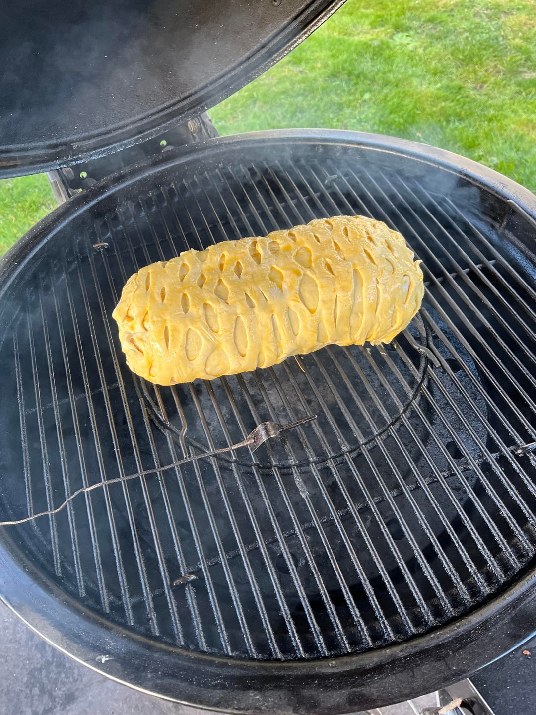 Obviously I should have cooked my duxelle a little more, as there was still moisture in it, lesson learned there, the crust would have stuck better with less moisture I assume. My temp never wavered, I monitored with my fireboard (the fan is permanently mounted on my WSM) and I had a little crispier crust then I wanted (bit black center bottom) so if I do this again I’ll go longer on the duxelle and then bake at 400 instead.