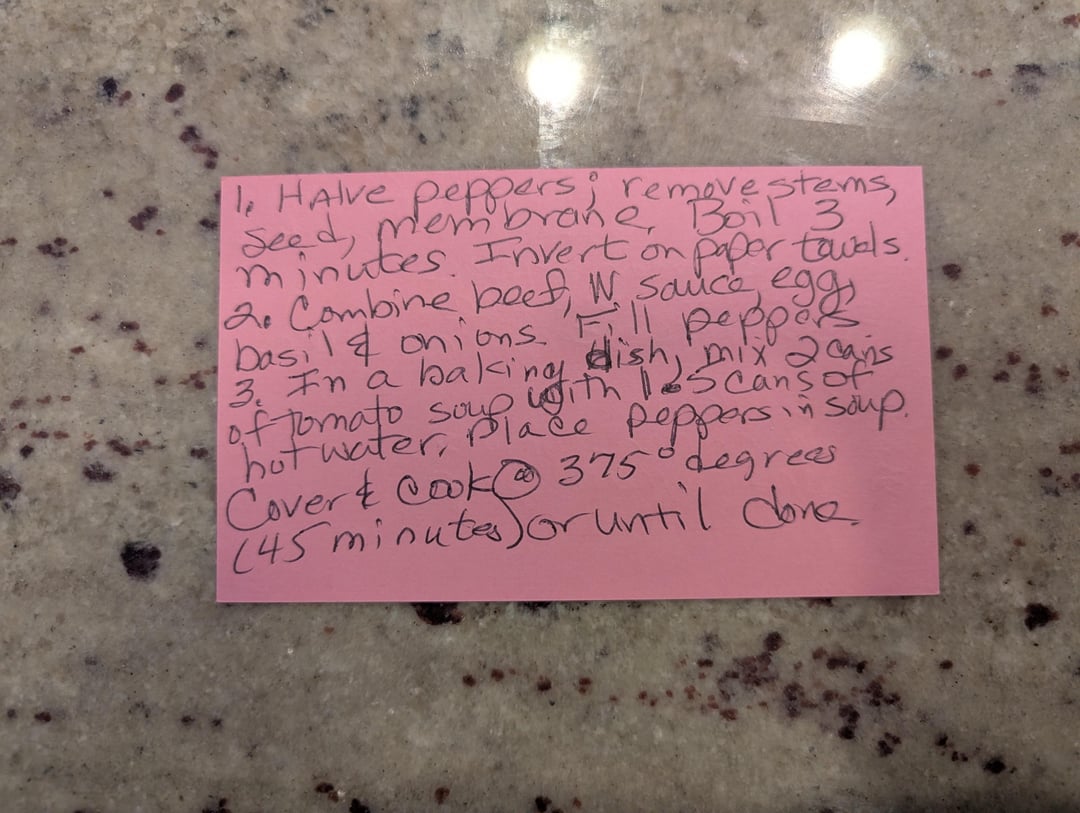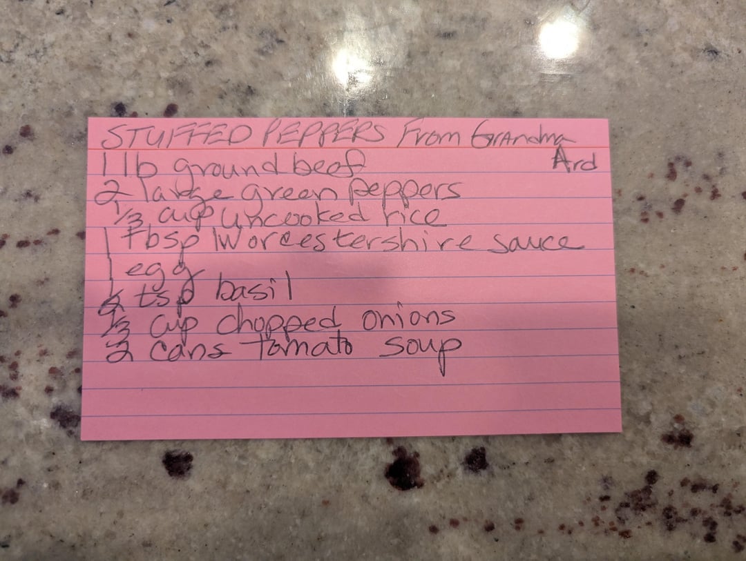 Hey y'all! I've made another recipe from my grandmother's collection. This recipe comes directly from my grandmother, and it's one of the few recipes that I know she actually cooked (circa 1960s and 70s) for my mother. Mom still makes this recipe every once in a while. The only change I made is that I used whole bell peppers and scaled the other ingredients to make 6 servings. It's very easy to make and pretty quick.for a casserole, but could probably use some spices. Also, my grandmother doesn't say to use Minute Rice… But I think she had to have used it because I can NEVER get the rice to fully cook! The rice in the center of the pepper is always still a bit hard 🥲 if you try the recipe, please use Minute Rice and report back!