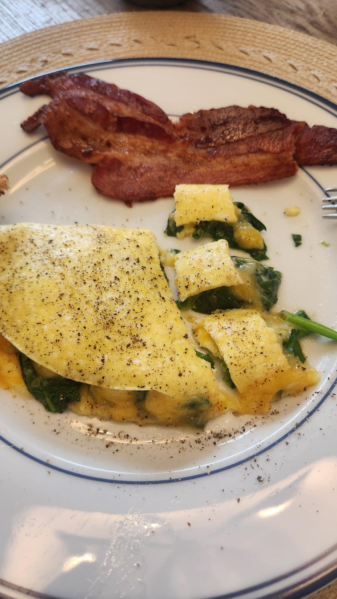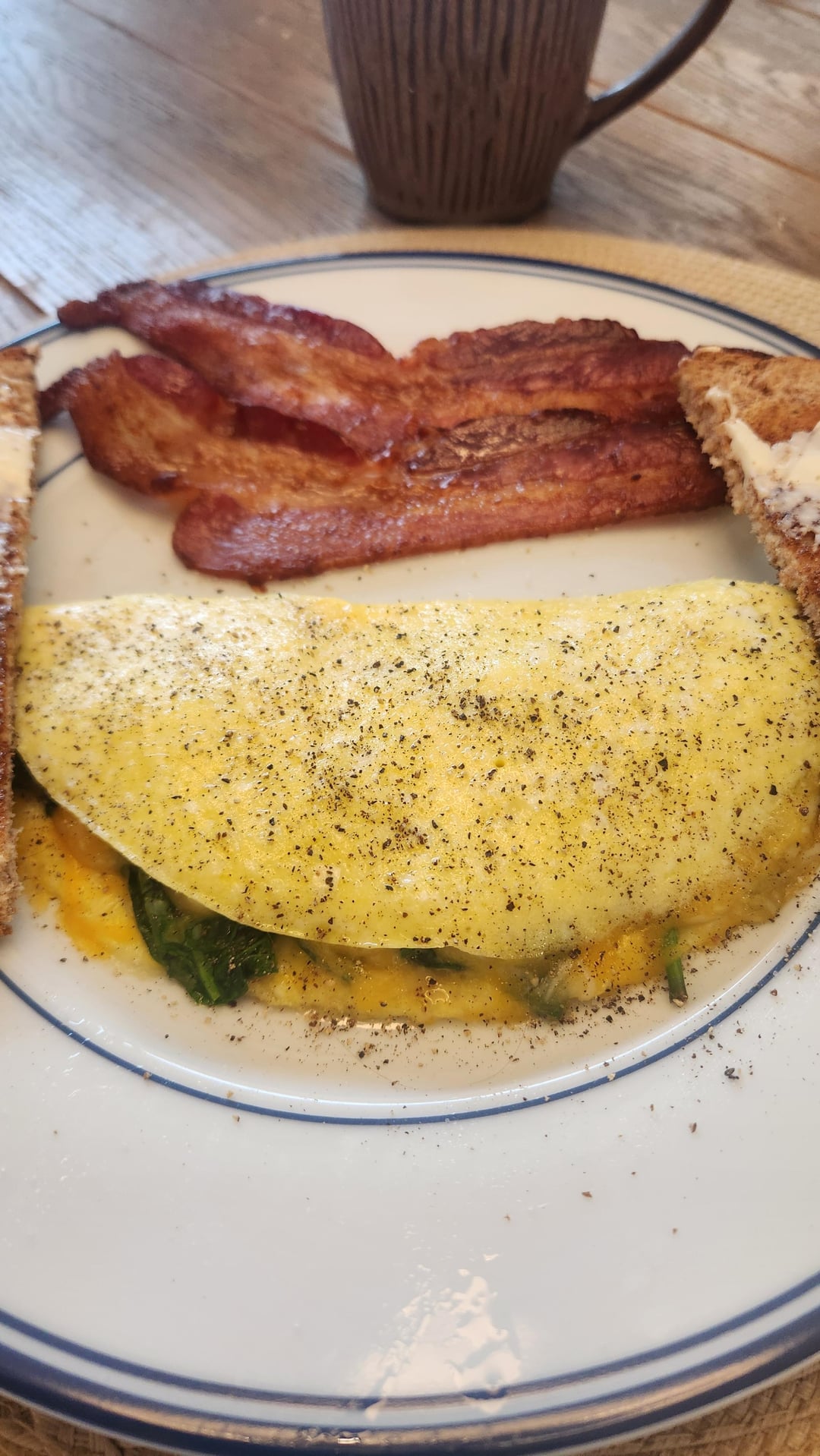 Spinach and cheese omelet, applewood bacon and whole wheat toast