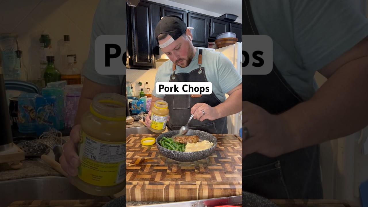 Tonight for dinner, we’re making an oven baked pork chops, mashed potatoes, and green beans. So, this is a relatively easy recipe. You can really marinate the pork however you want. You can just do salt and pepper. I’m going to kind of make a little bit of a brown sugar cumin kind of marinade, easy green beans, and then some quick mashed potatoes. And I know I said it before, but if you guys are trying to save a little bit of money, buy pork. It’s always cheaper than chicken. It’s cheaper than beef. It’s super easy to make. These are six um thick cut pork chops that were like 12 bucks. Get pork. [Music] Hey, Pork and applesauce, green beans, and mashed potatoes with gravy. Why do we have applesauce? Cuz pork and applesauce go tastes good together. You just wouldn’t think it. Try it. Almost thumbs down. Almost a thumbs down. Try just a piece of pork. This the saddest hund of all time. Good. Good. Want to try some? [Music]