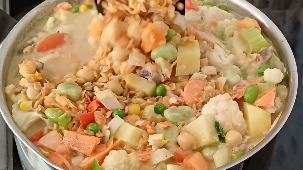 Now we’re making a vegan ka using red lentils, green lentils, chickpeas, a potato, a sweet potato, some cauliflower, two mushrooms, two tomatoes, a carrot, half an onion, half a pepper, some celery, a chili, some ginger, four cloves of garlic, some cabbage, some frozen soy beans, some frozen baby broad beans, some frozen mixed veg, a tin of coconut milk, some coriander, some turmeric, some cumin, some cloves, and some ground black pepper. Put some red lentils in a pan. Add some green lentils. We’re using dried chickpeas. You do need to soak them in water for 24 hours before using them. Add some of the soaked chickpeas to the pan. Peel and dice the potato and add it to the pan. Peel and dice the sweet potato and add it to the pan. Cut and wash some cauliflower and add it to the pan. Wash and chop the mushrooms and add them to the pan. Wash and chop the tomatoes and add them to the pan. Peel and grate the carrot and add it to the pan. Chop the onion and add it to the pan. Chop the pepper and add it to the pan. Wash and chop some celery and add it to the pan. Wash and chop the chili and add it to the pan. Peel and chop the ginger and add it to the pan. Peel and chop the garlic and add it to the pan. Grate some cabbage and add it to the pan. Add some frozen soy beans. Add some frozen baby broad beans. Add some frozen mixed vegetables. Add the tin of coconut milk. Add coriander, turmeric, cumin, some cloves, and some ground black pepper. Boil a kettle of water and fill the pan with water. Go to the stove. Put the pan on a high heat and bring to the boil, stirring well. Make sure to stir from the bottom of the pan. When it reaches the boil, turn the heat down and let it simmer for 30 minutes. Stir well throughout. And after half an hour, corn is ready to eat.