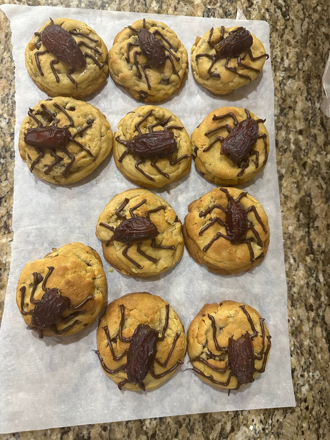 The roaches are dates, filled with pistachio cream so that when the kids bite into them, the green guts ooze out. Antennae and legs are piped chocolate and the cookies are just chocolate chip cookies I baked.