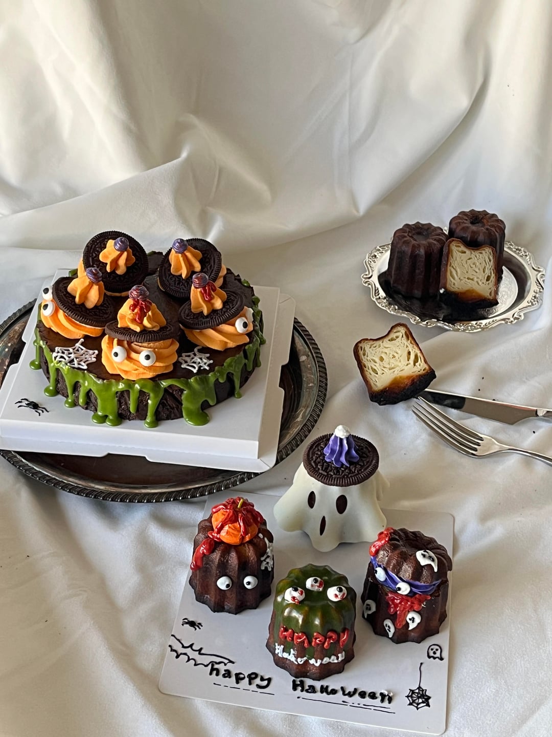 This year I came up with this set of designs of Halloween desserts. Caneles that dressed up as ghosts and basque cheese cake that become the fire ghosts has made up this cute little collection 👻