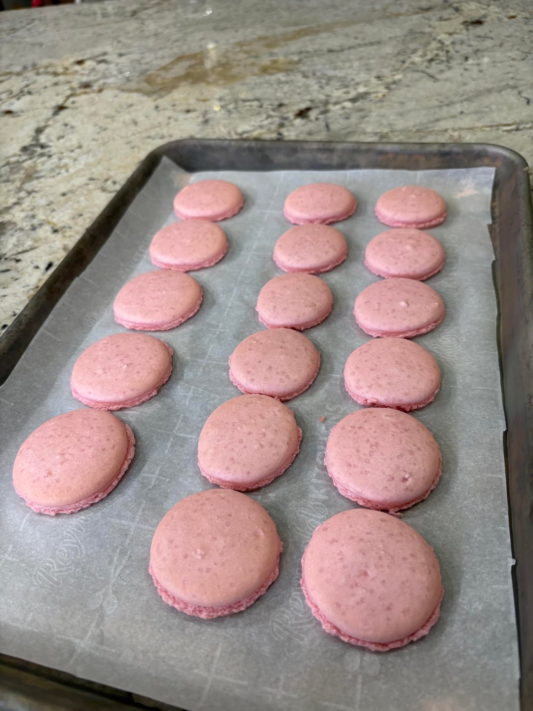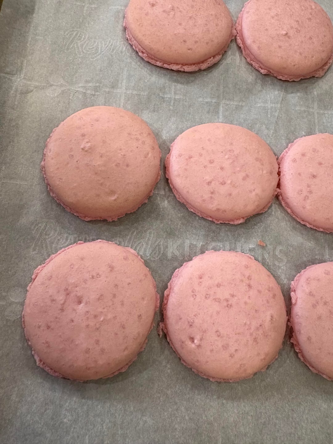 So I used Erin Jeanne McDowell’s recipe for vanilla macarons (variation listed on her chocolate recipe: https://www.erinjeannemcdowell.com/recipes/chocolate-macarons) and these did get feet, did rise, but have this mottled, freckled appearance.