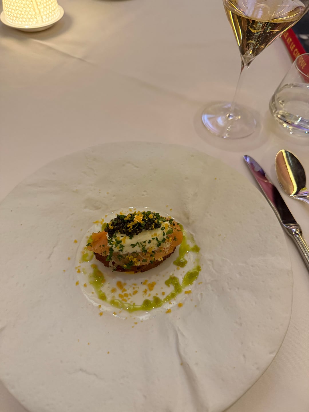 salmon caviar creme freche potato pancake solid but eh.