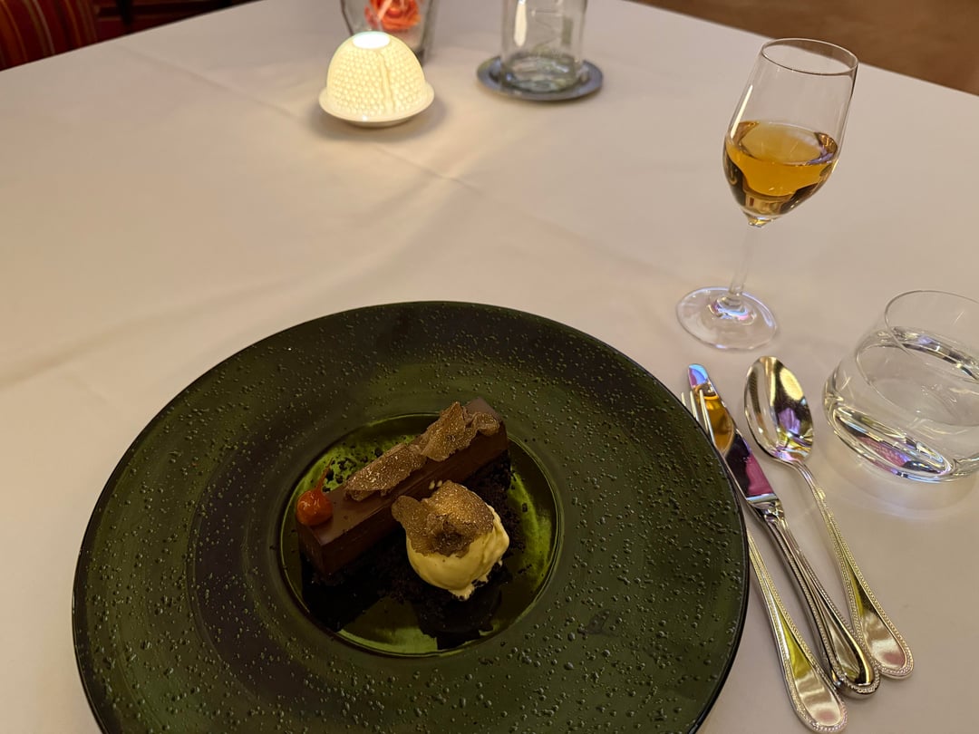 cake with chocolate cream black truffle shaving oreo crust vanilla ice cream. too rich after such a meal.