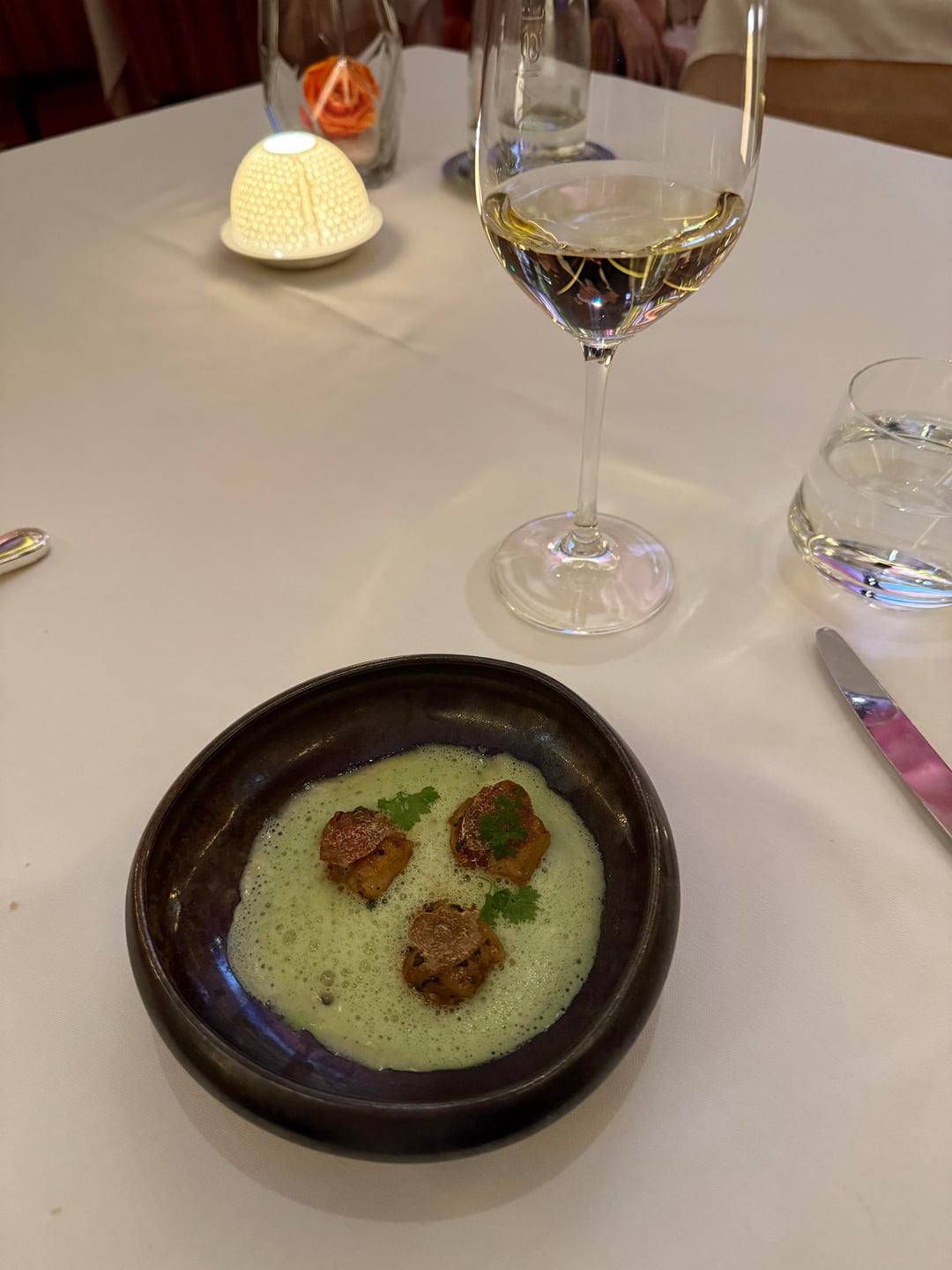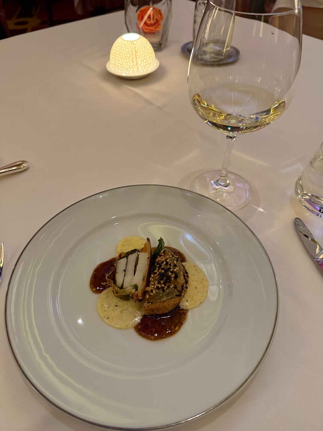 black tie scallop(!!!!!!!) 100/10. incredible. sesame topping, fried and layered, black truffle crème sauce (!!!).