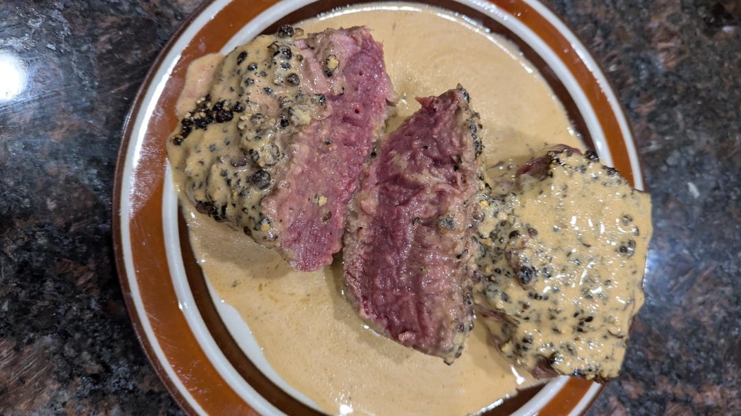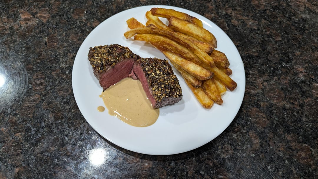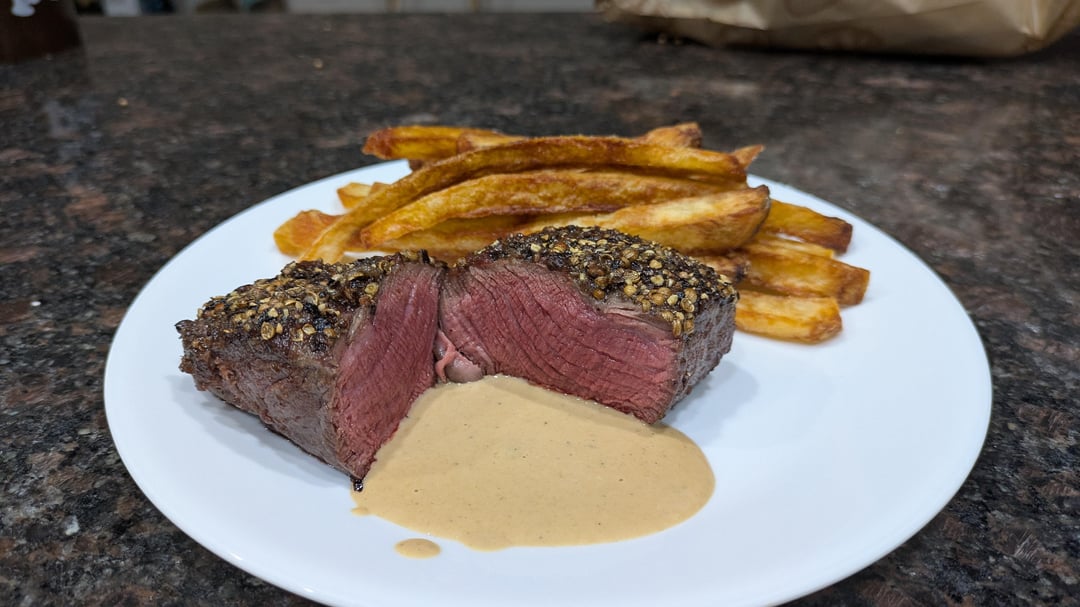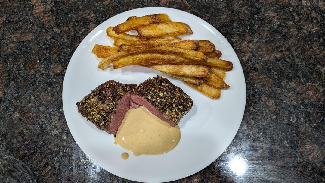 Good job but why not put all that pepper in the sauce and get a good crust on the steak? Just make a peppercorn sauce and cook the steak properly with a good crust. I’d hate to see that steak with the peppercorns scraped off. It’ll just be a soggy gray piece of meat.