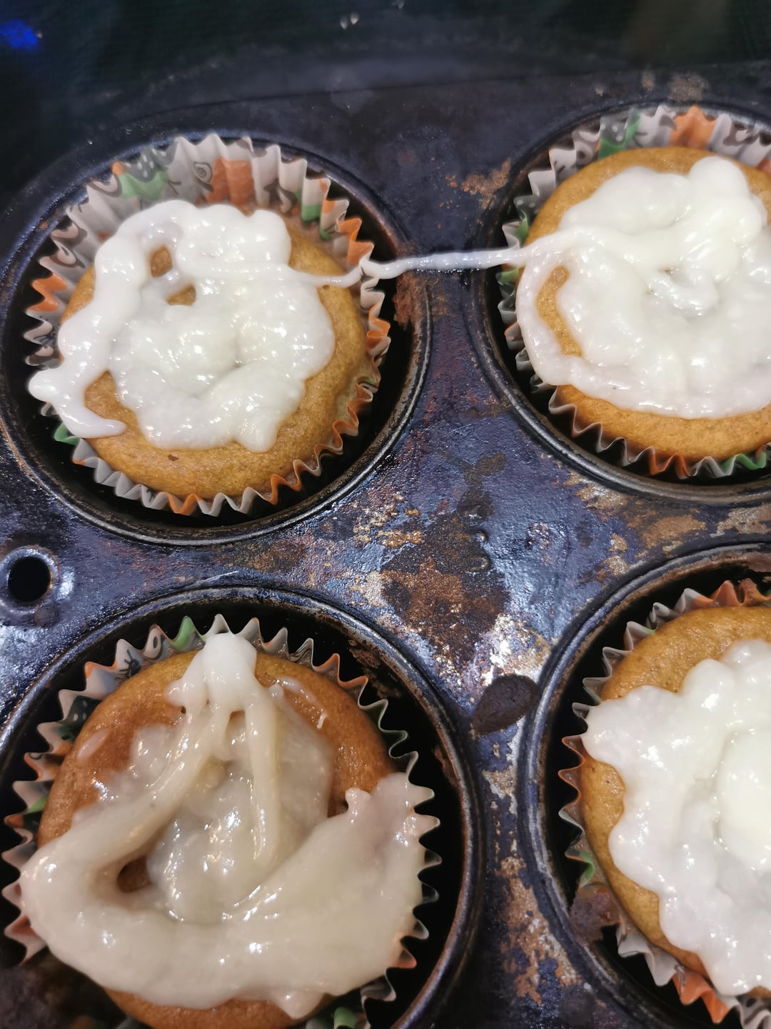 Pumpkin cupcakes with cream cheese icing but the lemon juice must’ve reacted with the cream cheese so it went all lumpy and lumps got stuck in my piping bag so it literally shat out of the bag like cum from a penis. Tastes good though
