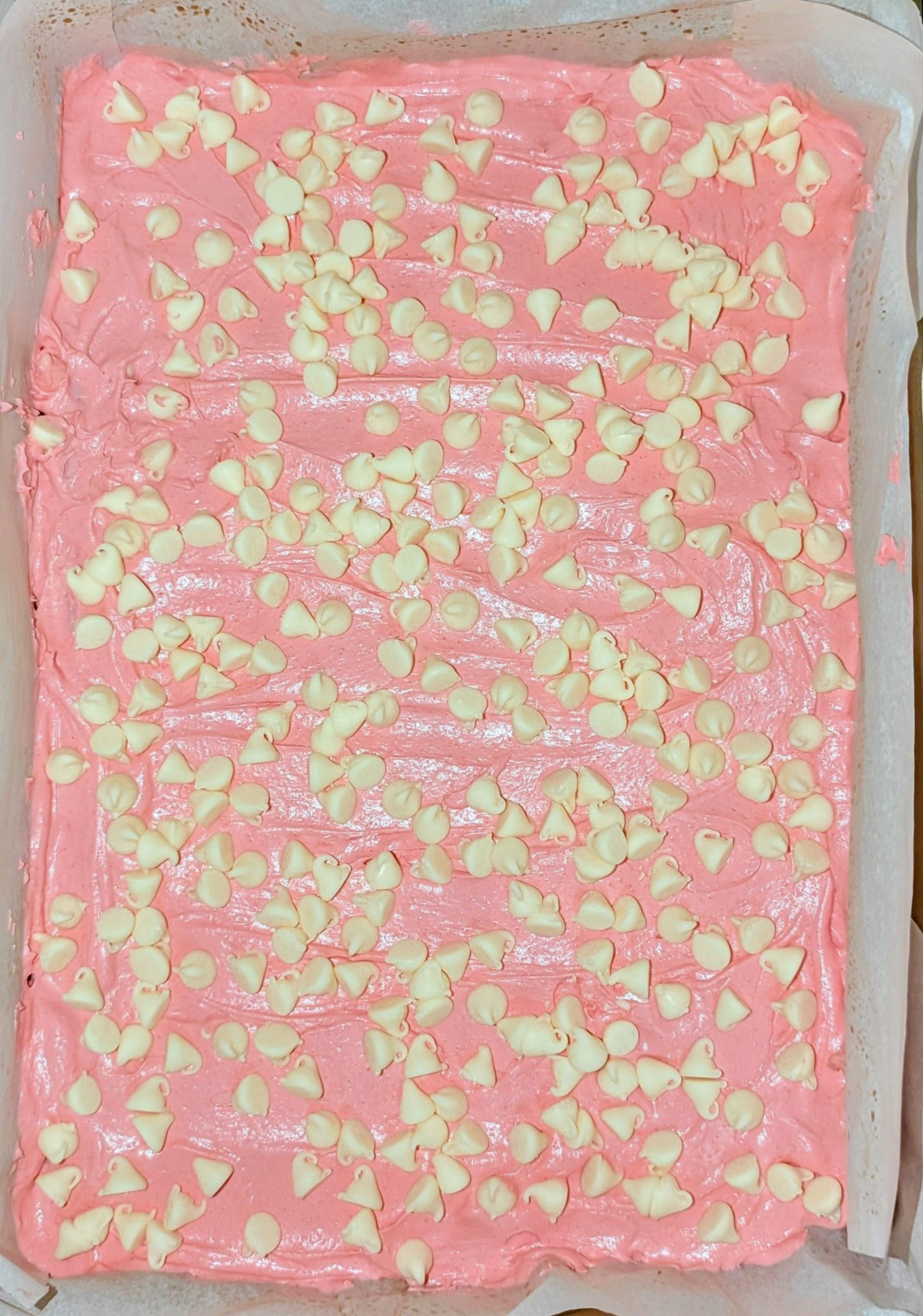 Strawberry brownies with strawberry frosting and white chocolate chips