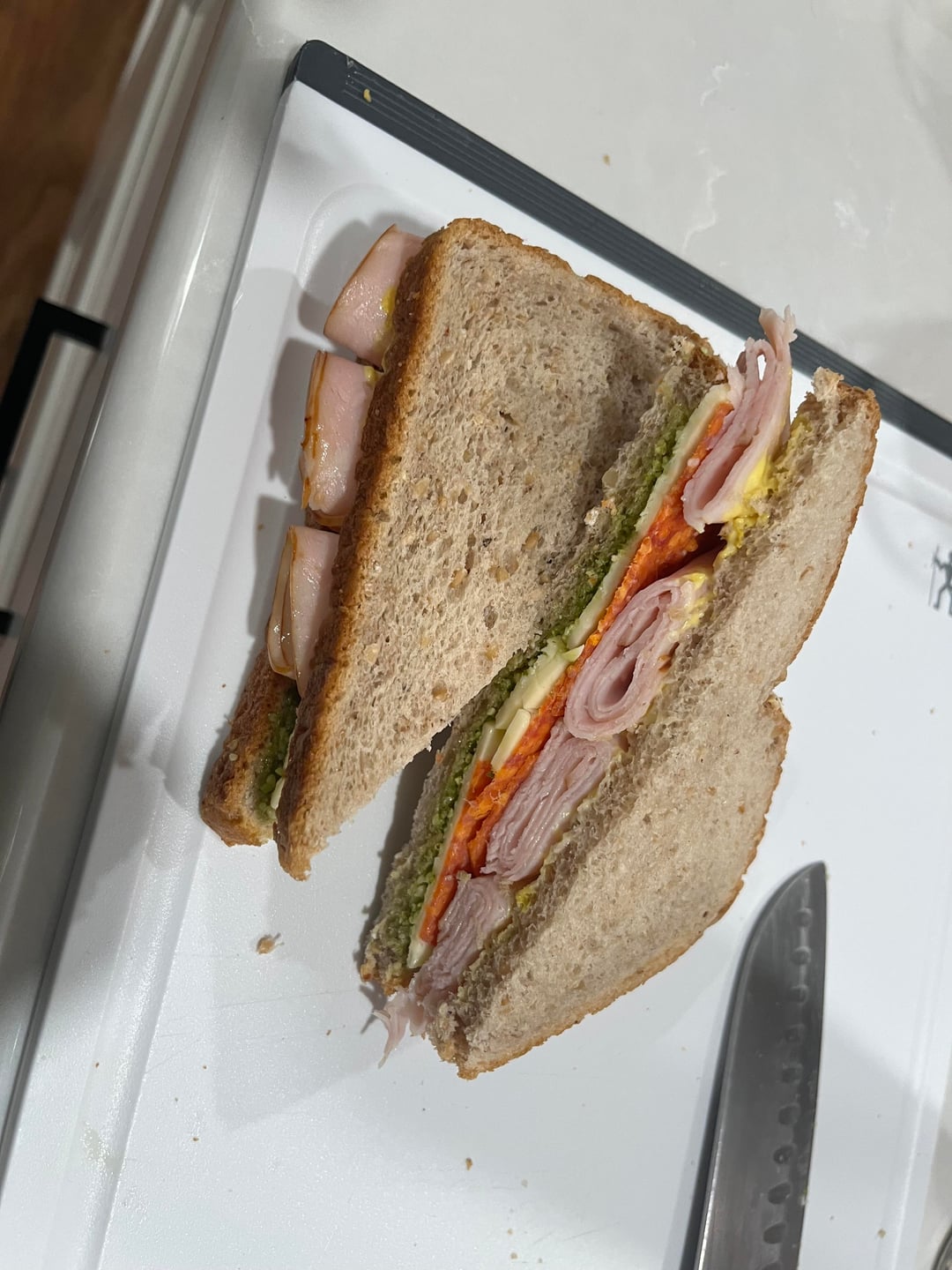 Pesto, havarti, pepperoni, turkey, mustard & mayo on honey wheat bread
