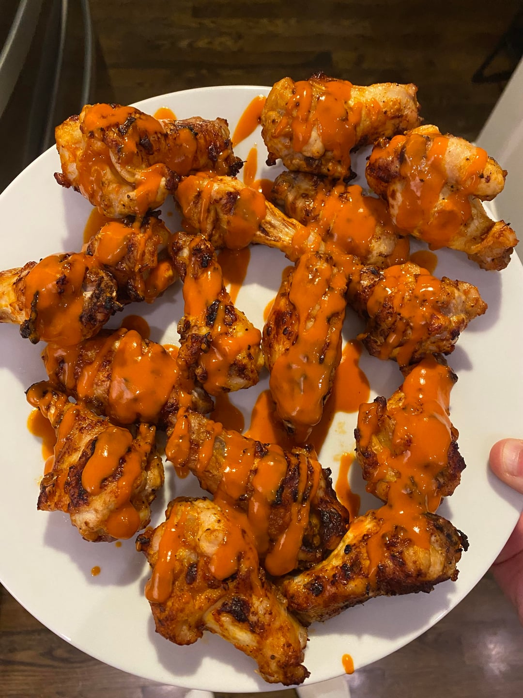 If taking the time to grill wings, usually worth it to use the real melted butter and Franks or more elaborate sauces since those take about 1/10th the overall cooking time. And also spin the wings fully in the sauce. Just a couple tips that you’ll thank later.