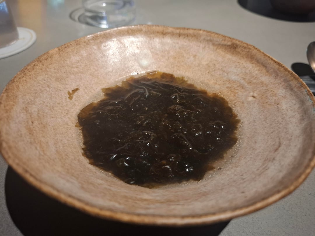The questionable brown sludge was described as a palette cleanser and was a clear broth with a bunch of seaweed in it.