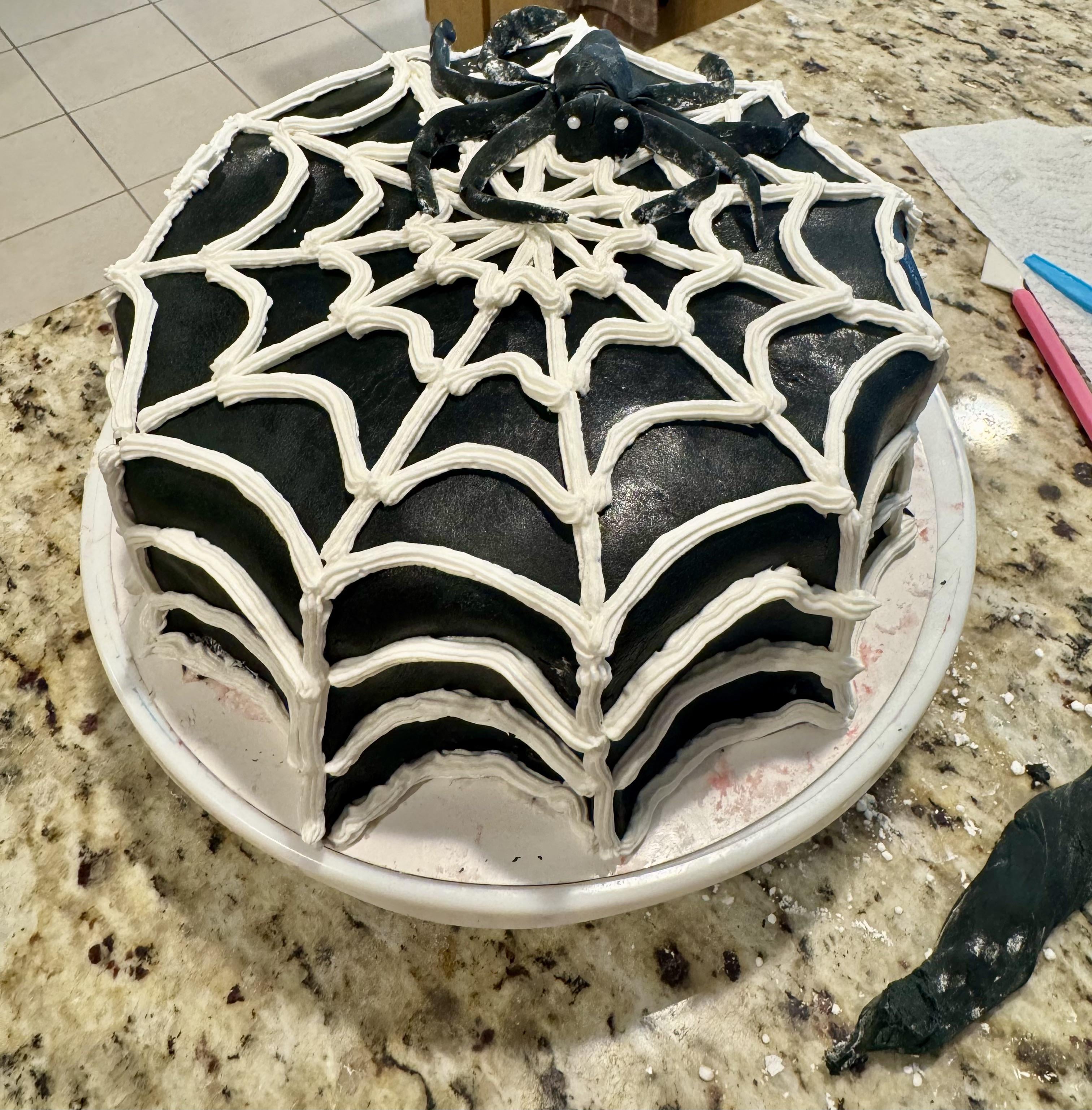 I’m sitting here thinking about round cutters and how I’d recreate this. What a great cake. Kudos. But where is the fondant? Covering the cake with those points? But how???? Or are you saying just the spider himself?