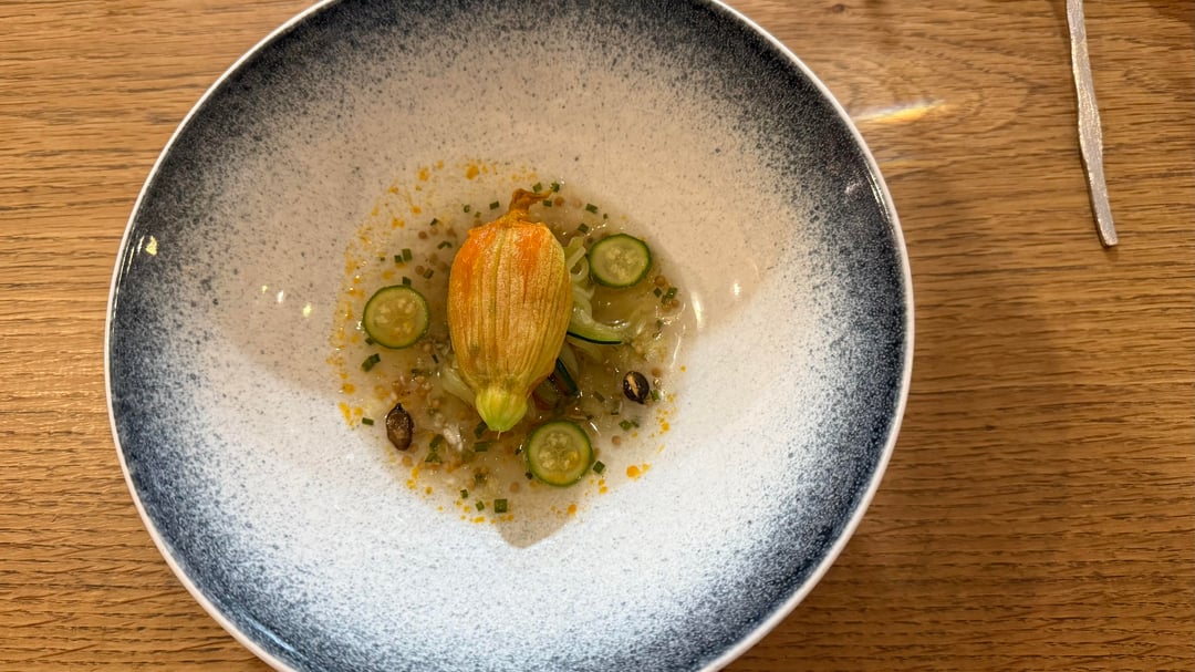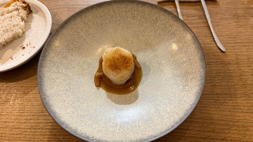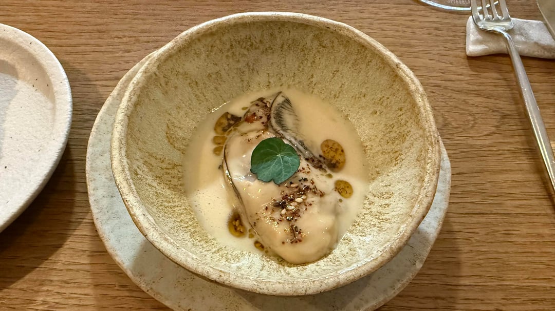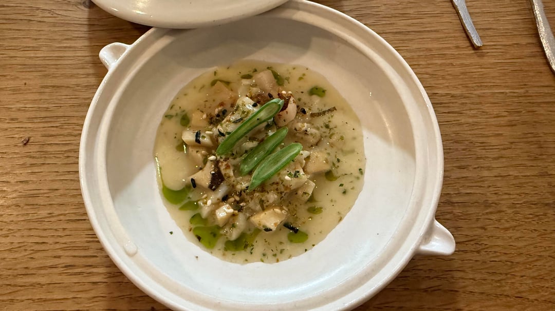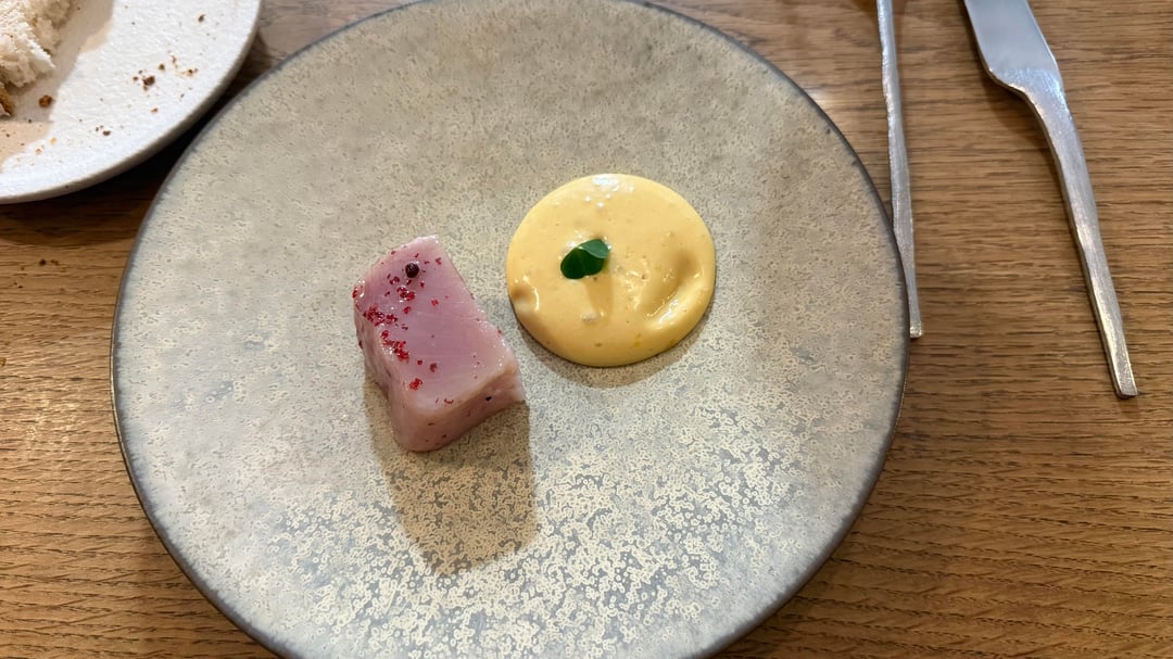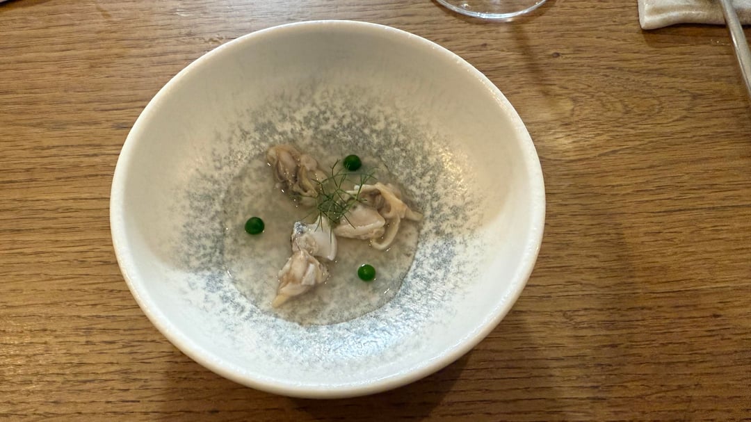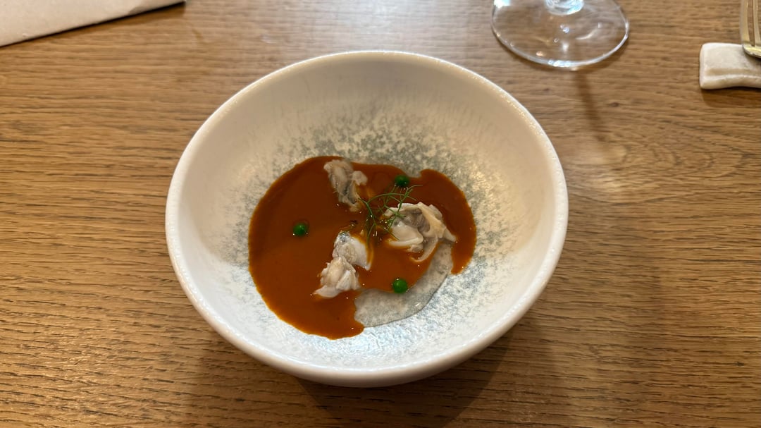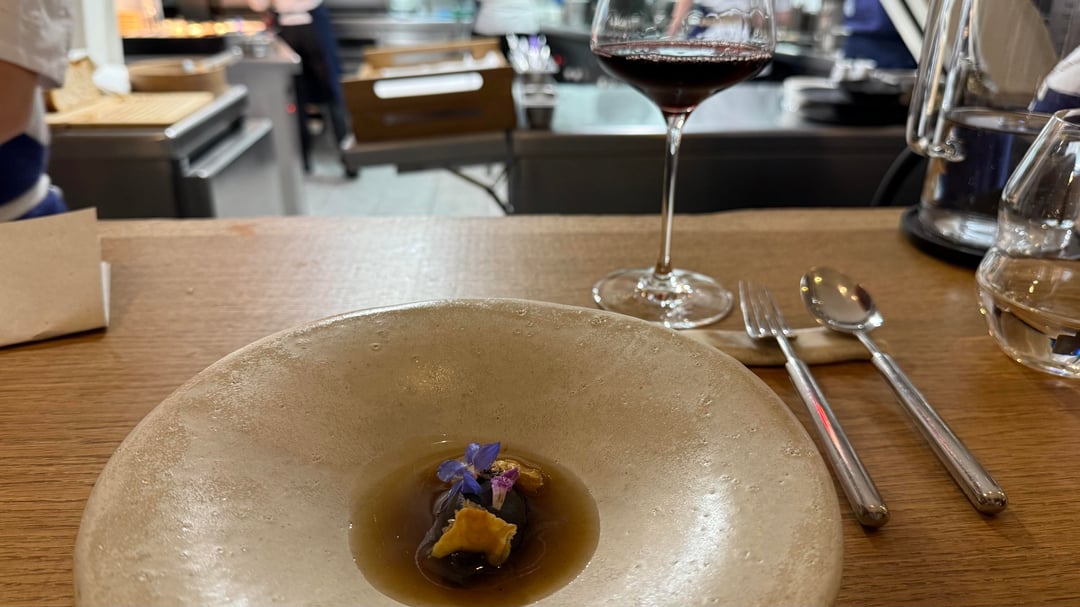 I was in Bilbao for a wedding, but booked a single seat at Mina for Sunday 9p to have a great meal hopefully before flying out Monday. I do fine dining solo all the time, especially when traveling. But at the wedding, one close friend who I never see asked what I was doing Sunday night, and when I told him, he asked if he could come. When I had booked, I had noted that I was fine at the counter, but my reservation came through as a "table," and I figured they would certainly rather have a two-top than a solo diner.