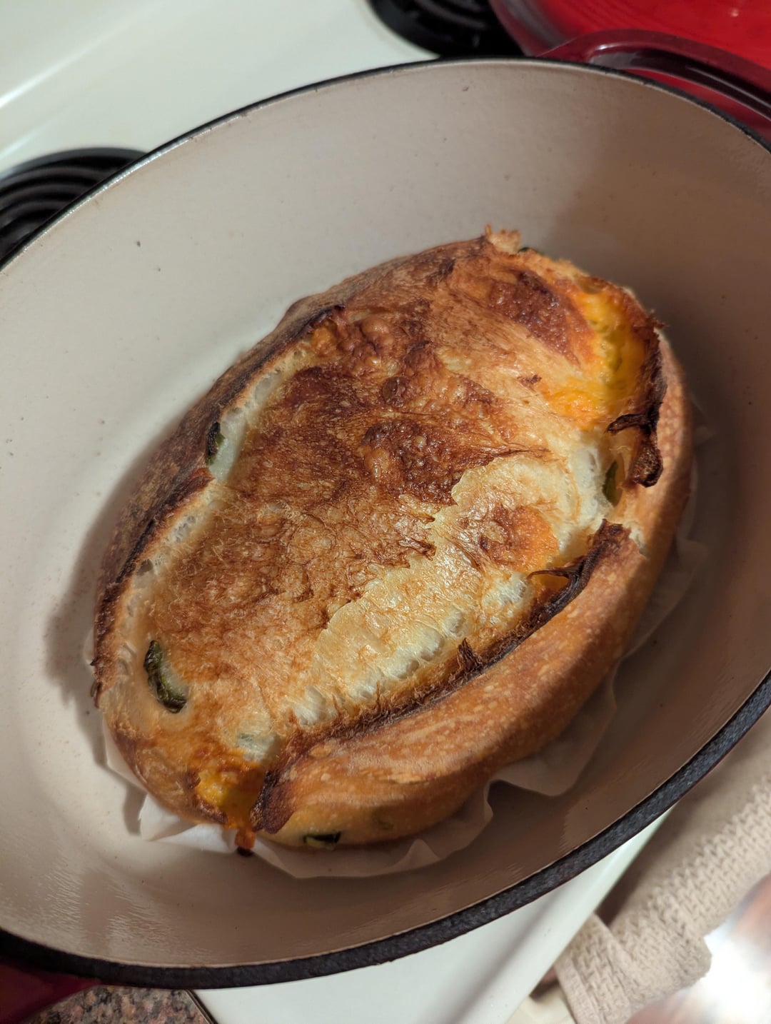 No knead. Fermented until doubled and then ~20 hour cold retard. Baked in cast iron at 500 for 25 minutes (heavily misted) and then for another 25 minutes at 450 with the lid off.