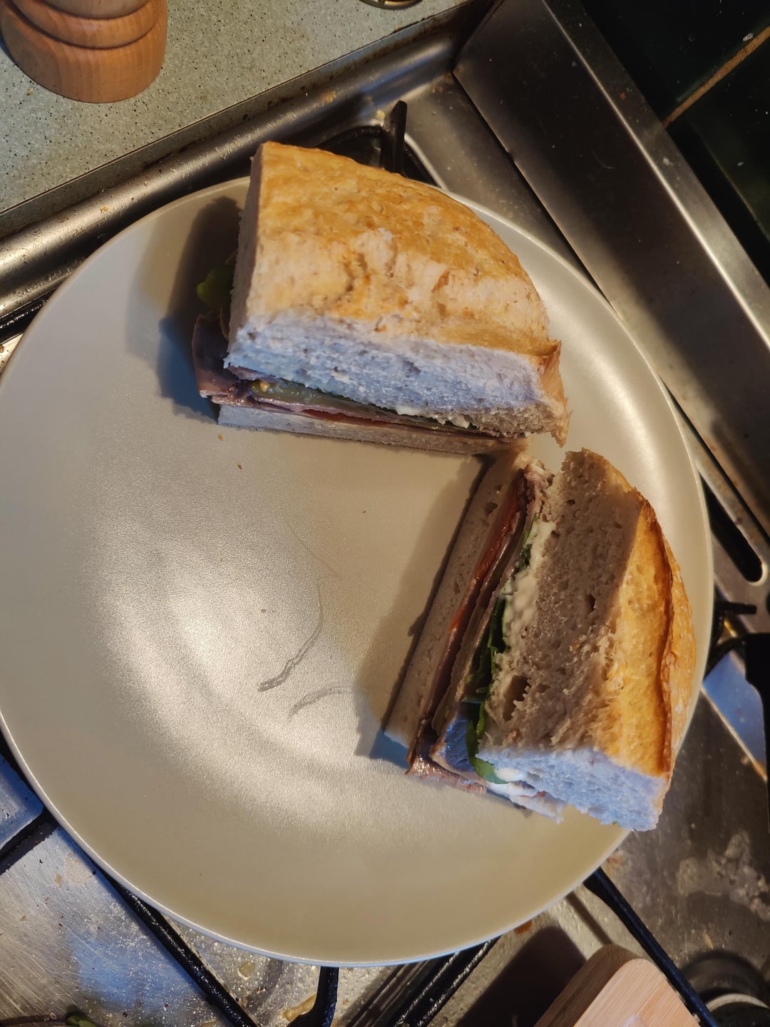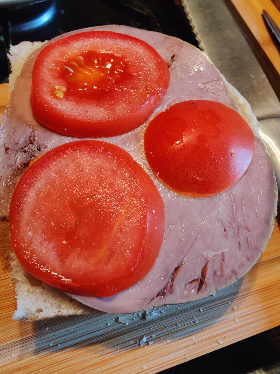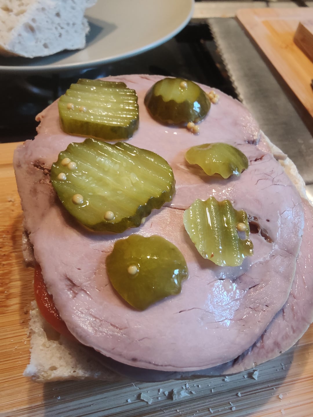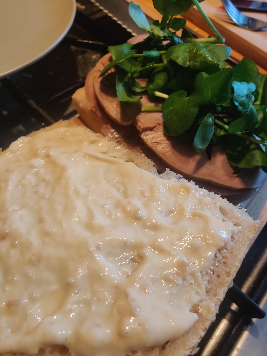I had some sliced roast beef sandwich meat that needed using up, so made a sandwich with sourdough bloomer, vine tomato, gherkins, watercress, butter, and horseradish mayonnaise. by tobotic Dining and Cooking