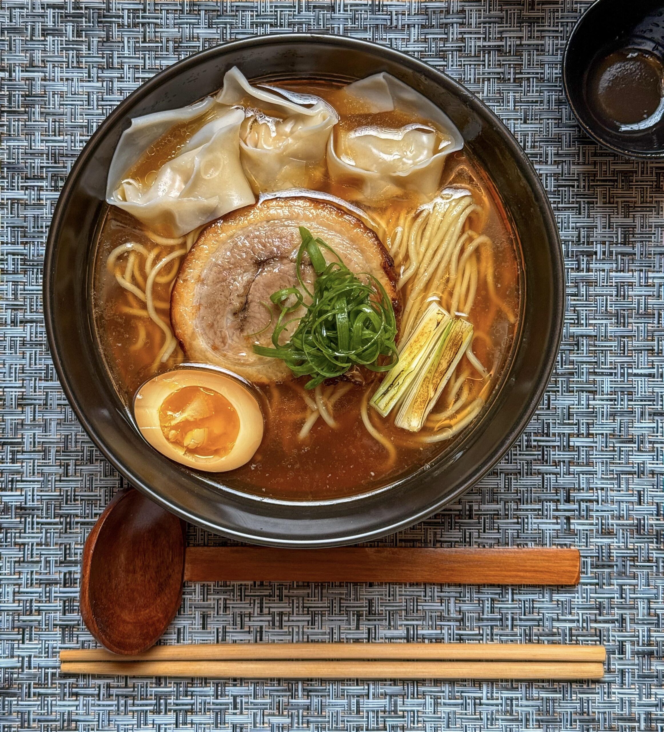 Tonight we have a chicken & duck chintan, shoyu tare, pork chashu, charred scallions, curled scallions, ajitama, and ground duck wontons (first time for me, absolutely incredible). Aroma oil is duck fat and garlic oil.
