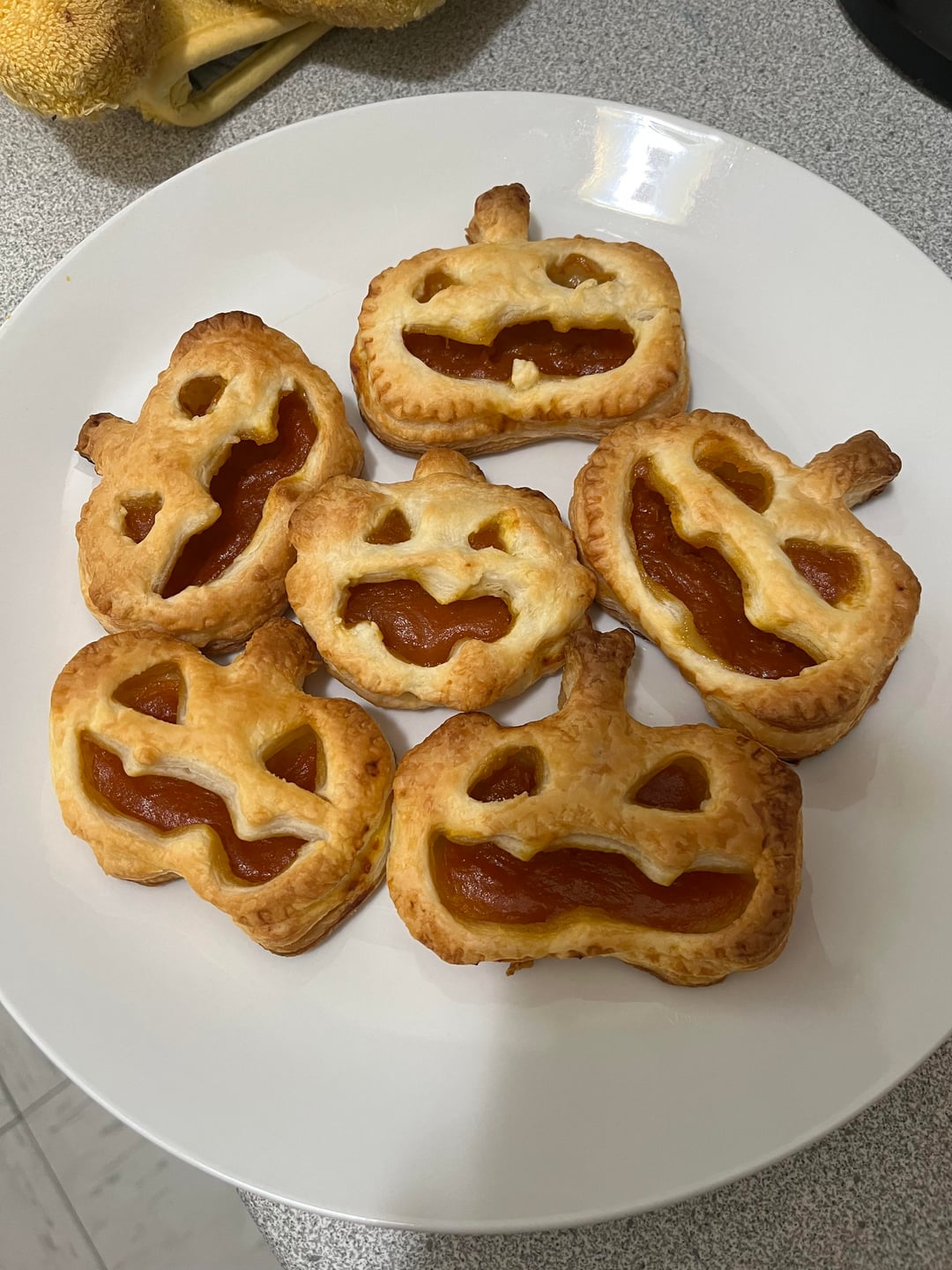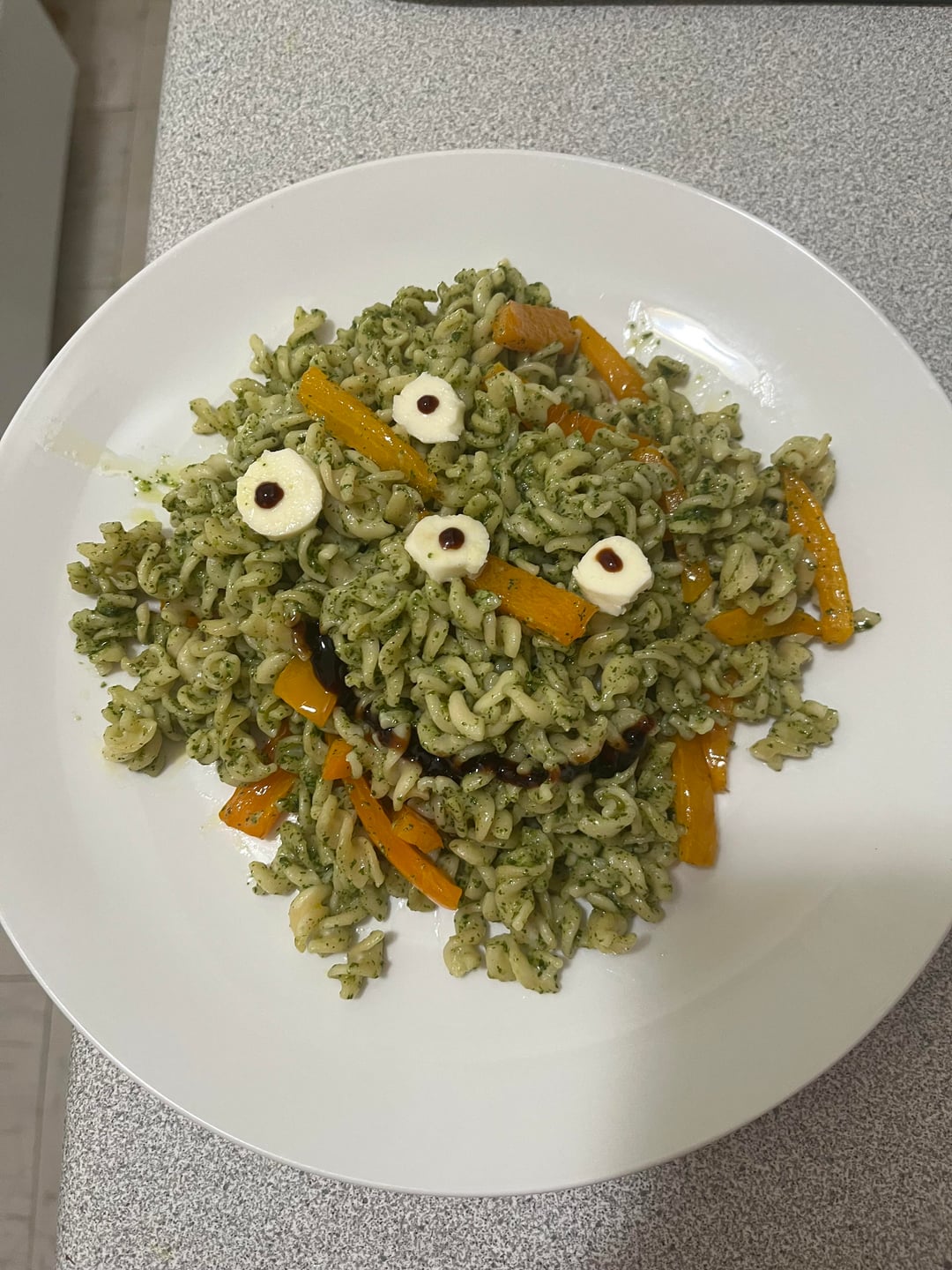 infi-polar 3 days ago Appetizer was caprese “ghost” crostinis, dinner was a “monster” pesto pasta w/ orange peppers and mozzarella eyeballs, and dessert was pumpkin pie filled pumpkin puff pastries