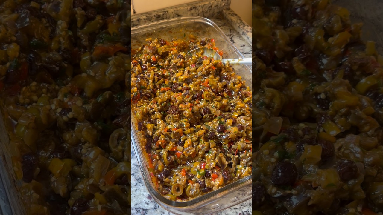 Caponata de beringela é uma receita cheia de sabor e que todo mundo repete. Eu sou a Fran Misturine e por aqui todo dia tem receita. E a base dessa caponata é berinjela e pimentões. Lavo muito bem, pico bem quadradinho, deixo de molho por 20 minutinhos. Eu coloco para hidratar também as uva passa. Escorre tudo muito bem, coloca na forma, acrescenta cebola. Eu acrescentei pimentões tanto do vermelho quanto do amarelo, mas pode pôr o verde também. Agora é só acrescentar azeitona a gosto. Pode colocar da azeitona preta também. Seis dentes de alho amassado, a uva passe, coloquei vinagre, azeite. Aí você vai colocar o tempero que você gostar. Coloquei páprica, sal. Agora é só misturar tudo muito bem. Gente, rendeu duas formas, mas aí eu lembrei, gente, que eu tinha essa grandona, aí eu coloquei todinho nela. Eu lembrei, graças a Deus. Agora é só levar pro forno. Eu amo fazer no forno. Dá para fazer na pressão? Dá, mas eu amo fazer no forno. O sabor é diferente. E aí ficou mais ou menos 1 hora20 no forno. E olha o espetáculo. Agora é só colocar um bom cheiro verde, misturar tudo muito bem, esperar gelar. Olha só de lembrar, minha boca virou um brejo. Essa receita é deliciosa para fazer de antepasso, para você servir aí com pãozinho francês à tarde. Que delícia. Se você gostou, curte