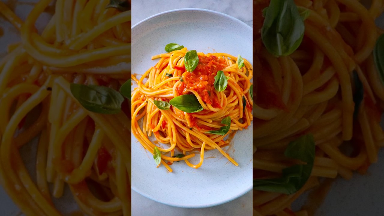 Ladies and gentlemen, today we are making pasta pomodoro. Look at this fresh cherry tomatoes and basil pasta. Oh, get those cherry tomatoes and let’s cut them in half. Okay, of course, we start with the extra virgin olive oil. I basically like to crush my garlic because I like the flavors of crushed garlic. Let’s add the tomatoes inside. Let’s put a nice generous amount of salt and pepper. Cook it on a medium low heat. Okay. What we do is we put the basil. So, what we do here is we break the stove so the flavors come out. So, the juice come out. You press on them. Okay. After 10 minutes, we remove the basil. We’re going to blend this wonderful juice here and these tomatoes. One nice tablespoon of sea salt. to twist and put the pasta in there. Let’s finish our sauce. Okay, we’re going to break the basil in there. Break it. All right, let’s get this beautiful spaghetti. Yum. We’re going to put a little bit of pasta water in there. Just a little bit. Toss, toss, toss, toss. Raw extra virgin olive oil. Last but not least, we need to add more basil on top, please. More basil. M.