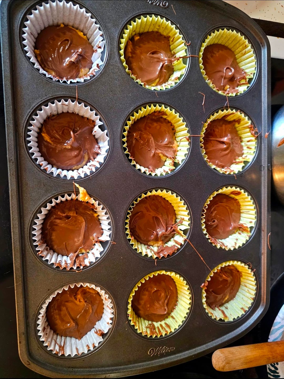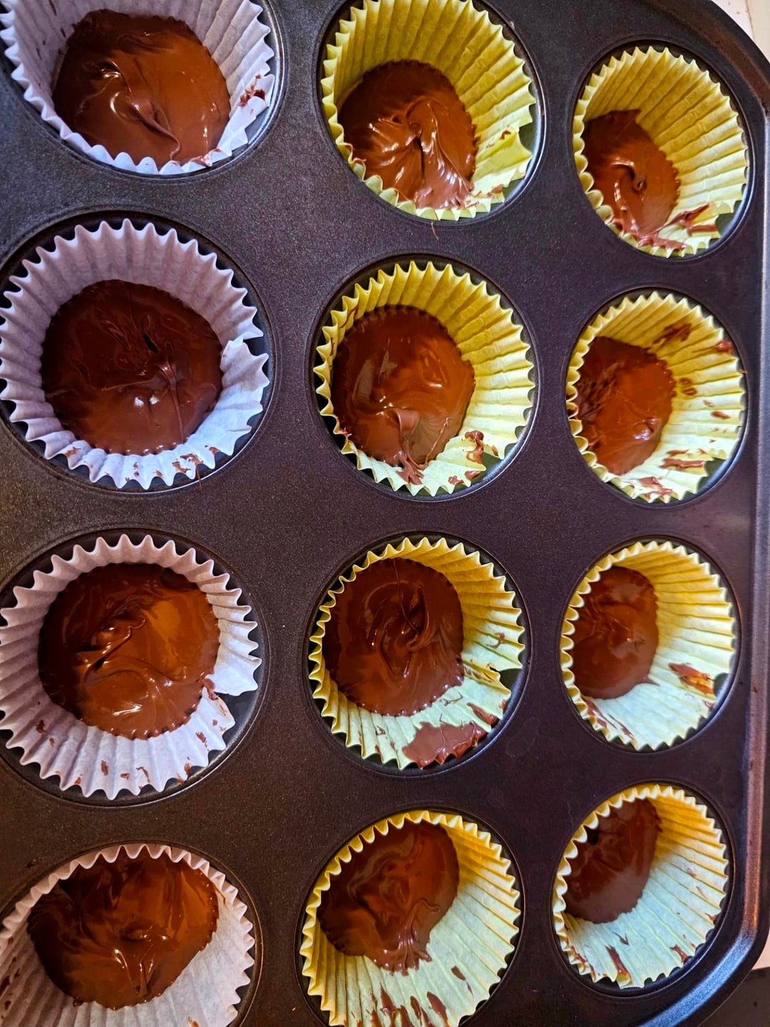 Line a muffin pan with wrappers then layer the melted chocolate, peanut butter mix, and a top layer of melted chocolate, spread the top layer around for full coverage and chill until they firm up. This makes a dozen so you can eyeball it like I did or measure out 12 equal parts of each layer but that takes too long.