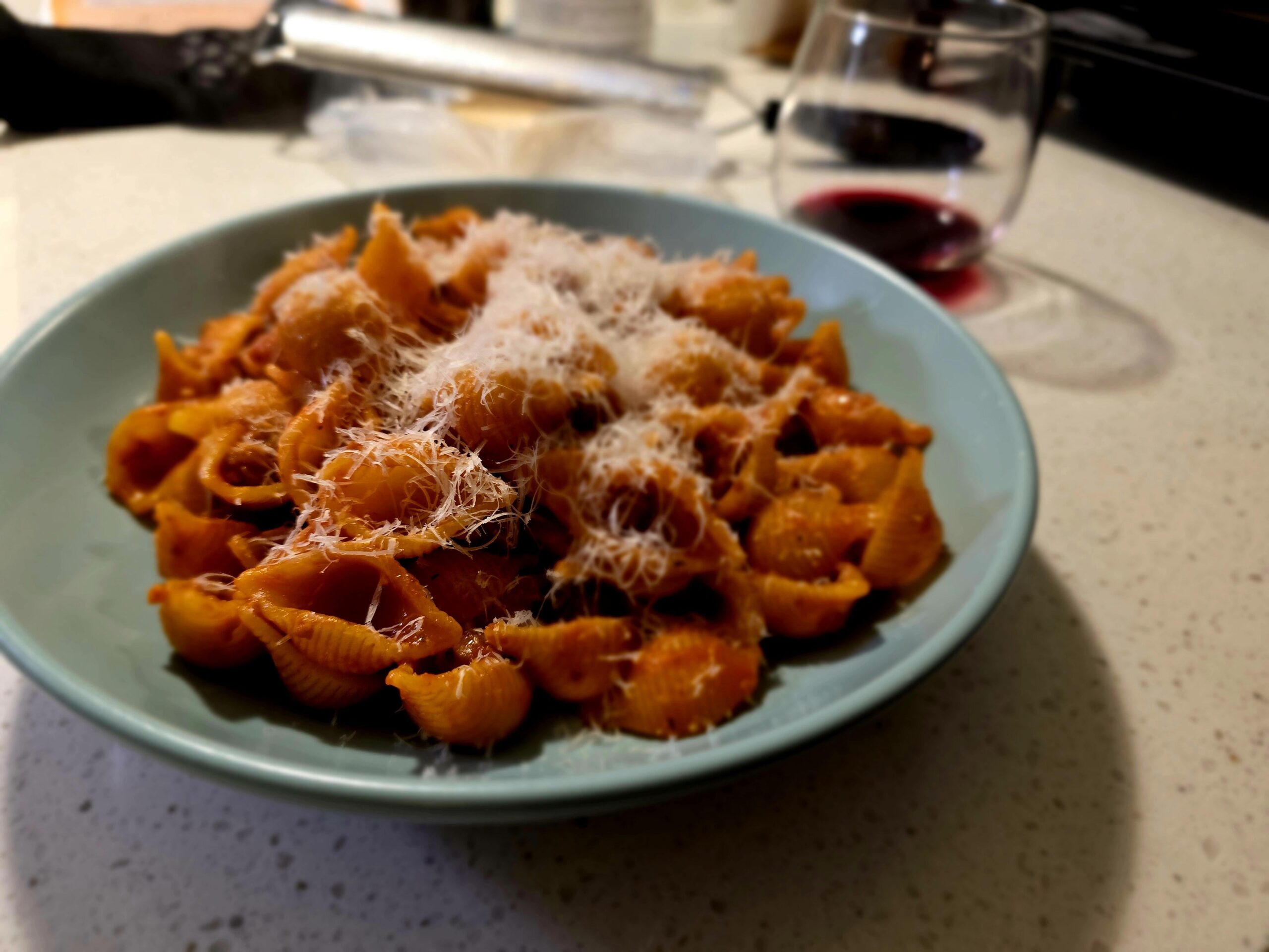 Simple sausage, pasata and shell pasta after trick or treating in the rain