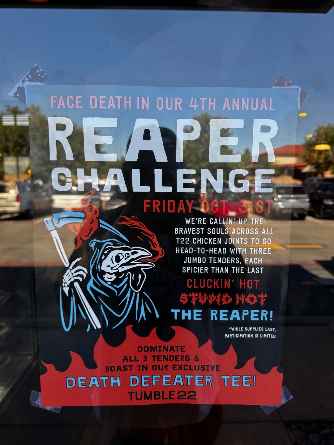 It’s their two hottest tenders (Cluckin Hot and Stupid Hot), as well as one additional “Reaper tender” that they only do for this challenge.
