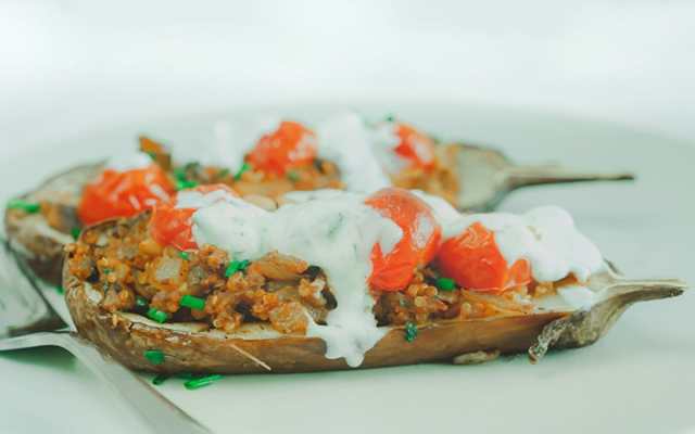These gluten-free Mediterranean Eggplant Boats from Alenoosh Matkupan are packed with nutrition. The spices, fresh herbs, and quinoa pair beautifully with the vegan yogurt sauce!