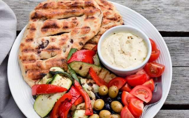 3. Grilled Vegetable, Olive Flatbread, and Hummus Plate