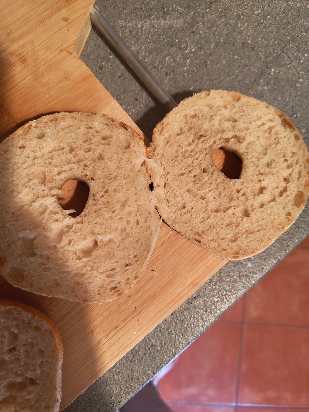 10 hours bulk fermentation, shaping at 130g each. Rest for 60 mins. Boiled for 90sec per side and at 210C for 20 mins.