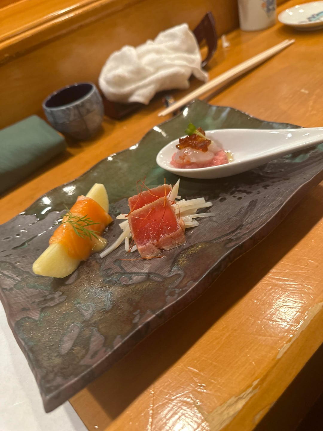 1. Zensai looks to be fresh takes on Kiyoshi’s old standard zensai courses. Generally, a bit flat relative to previous restaurant but appreciate new take on these for the new restaurant 1. Atlantic salmon w shiro miso sauce, tiny sprig of dill and Fuji apple – didn’t love it but I hate salmon so its probably me. Kiyoshi did something similar that I also don’t like and so barely remember 2. Yellowfin tuna zuke w batons of potato, lemon and thread chili – fun take but a bit meh. Kiyoshi did the same did yellowfin zuke but with a small lemon mash that I preferred 3. “Spoon of happiness” – minced toro, ponzu jelly, amaebi, truffle oil and ponzu jelly – actually pretty much the same as Kiyoshi, don’t super love either take on it 2. Owan course – clear dashi (standard kombu + katsuobushi), matsutake and ebi shinjo w edamame. Nice aroma, dashi was well done but pretty strongly flavoured – ymmv with that. Shinjo was alr – edamame dominated the bites it was in so I didn’t get a lot of the sweet meatyness from the shrimp I was hoping for but it was constructed well and cooked properly unlike similar at Shin 3. Sashimi – mistakenly sent. Ended up being comped – not reviewing 1. Tai 2. Kanpachi (not the hirenaga one) 3. Akami 4. Chutoro between that and toro 4. Nigiri: 1. Kinmedai, mostly flat – not particularly fatty 2. Kamasu w jikasei yuzu kosho, good not great. With spots like these I almost like solo toppings like these as they usually simple and well made for the most part. This yuzu kosho followed in that trend and went nicely with the kamasu 3. Sanma with negi and ginger, actually pretty good – kinda happy w this even tho seasons almost done 4. Aori ika w ginger, slightly sweet before the ginger and wasab kicked me in the nose lol. Would have been a decent piece with better control of them tho 5. Taiwanese hirenaga kanpachi shioyaki w fried burdock, honestly nicest thing that night. My favorites for the night would be either this or the chawanmushi. The hiranaga was cooked really perfectly and the fried burdock added this like nice additional salinity to the whole thing that resulted in a dish that was honestly better than some versions at the like $200-300 spots here 6. Nigiri: 1. Hirame kombujind w engawa topping, eh. Engawa wasn’t great either 2. Fujimasu, fatty n clean. I don’t like trout or salmon, but if I have to have them I prefer trout like these or the really wild n fancy salmon 3. Katsuo from shizuoka w momiji oroshi, looks to have been pre grilled and rested. Clean tasting – katsuo, at least the ones that have made it here, have been kinda lean just given the more warm weather in Japan. The water in Japan does seem to have finally gotten pretty cold this week though so I imagine going forward we’ll start seeing fattier specimen. This one was eh but I didn’t hate it 4. Hotate w karasumi from Taiwan, Hotate was honestly pretty good n karasumi was of decent quality – I’m actually a fan of Taiwanese karasumi I’ve had thus far, even if I prefer the homemade/jikasei ones 7. Ikura, shiitake, enoki and kuruma ebi Chawanmushi, this was really good – honestly one of the nicer chawans I’ve had in the Bay. Everything came together really nicely and it was all cooked great, nothing overly mushy 8. Nigiri 1. Tachiuo, alright – nothing bad but nothing great 2. Chutoro w Karashi, pretty good – nice combo, their karashi is a bit too piquant though 3. Aburi toro, alright – better than I thought it would be 9. Standard fancier Miso Soup, you’ve had this a few times at those restaurants that used to be big in the 90s/00s I’m sure 10. Matcha and Honey ice creams either walnut, frozen farmers market persimmon and mint leaf