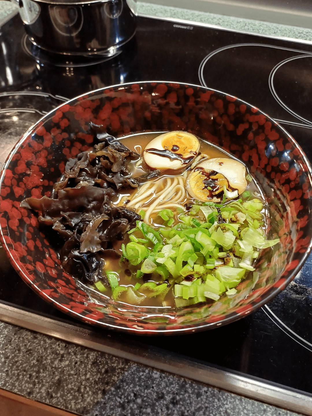 One Week ago i posted my first attempt at Torikotsu – yesterday i tried out Shoyu Beef Chintan, also in an Instant Pot. It was surprisingly suitable as a Ramen broth and had a good taste. I roasted the bones beforehand and cooked them under high pressure for 1,5 hours and without lid for another hour. Additionally i also did Mayu (black garlic oil) which perfectly complements the bowl. Toppings are wood-ear mushroom, marinated egg, storebought Ramen noodles and scallions.