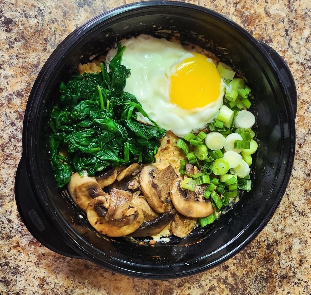 Breakfast Bowls: Old fashioned oats, sautéed baby spinach and mushrooms, green onion, shredded cheddar, egg whites and an egg.