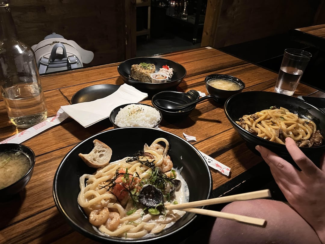 We had the tuna mayo onigiri, bulgogi udon, creamy shrimp seafood udon, miso soup, and normal rice. I am not lying when I say the beef was so deliciously flavourful and it melts in your mouth. It’s paired beautifully with the sauce. The shrimp udon is so creamy and the seafood is cooked perfectly and seasoned so well. The prices are great too. Everything we had was so delicious and we had enough to take home with us. I highly recommend.