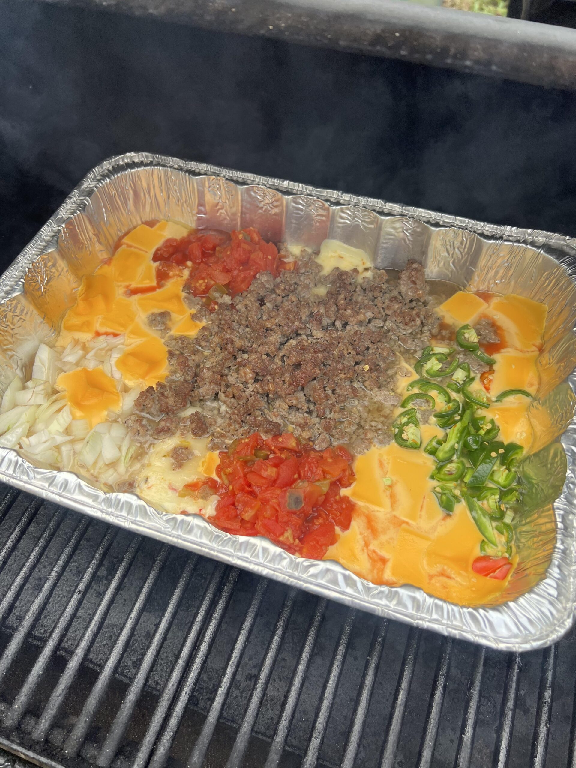Looks amazing. I want to recreate this! Ground beef, onion, tomato, rotel, jalapeños, Serrano, velveta, and cheddar? How long do you smoke it for? I might cook it in a cast iron