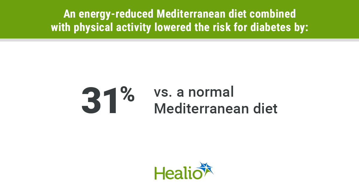 An energy-reduced Mediterranean diet combined with physical activity greatly lowered the risk for diabetes in adults with overweight or obesity vs. a normal Mediterranean diet, a study showed.