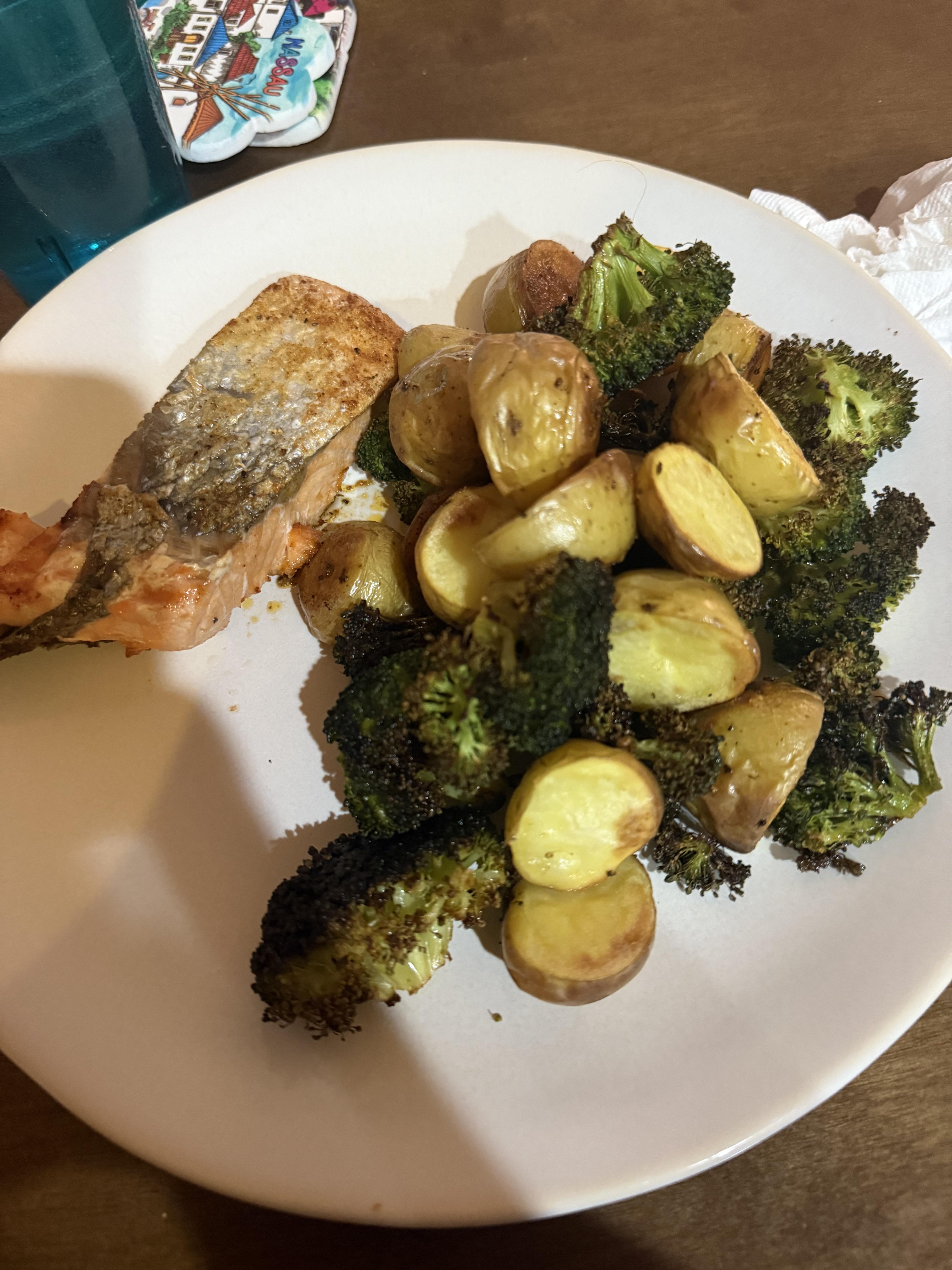 I’ve been flirting with the mediterranean diet as of late and I might not go full into it but definitely want to eat more elements of it to be healthier. I air-fried salmon and roasted potatoes and broccoli.