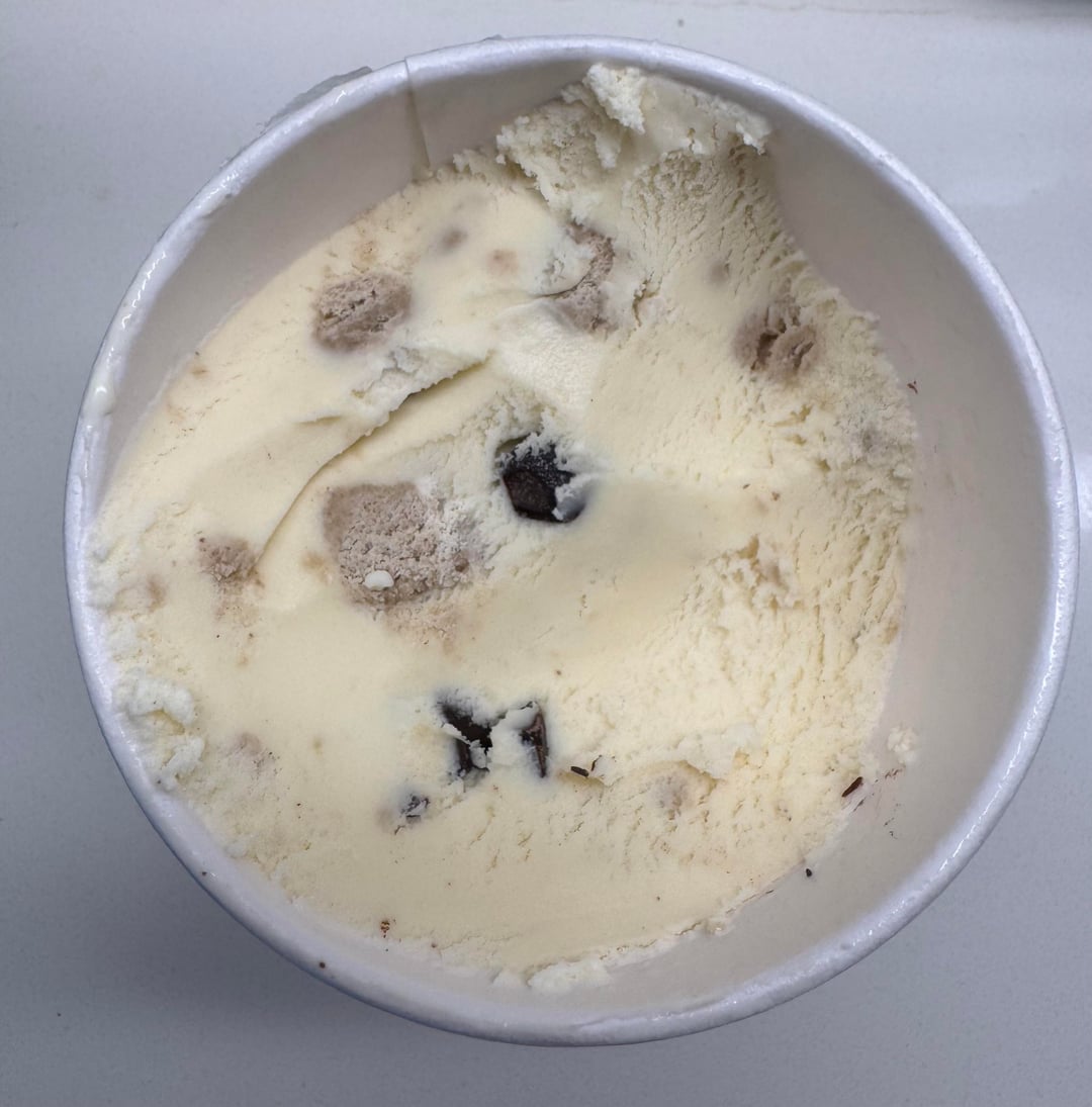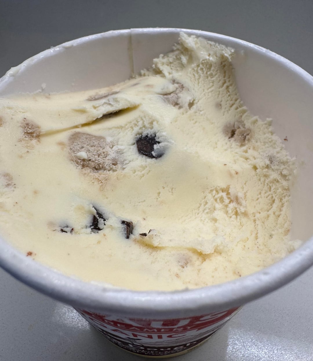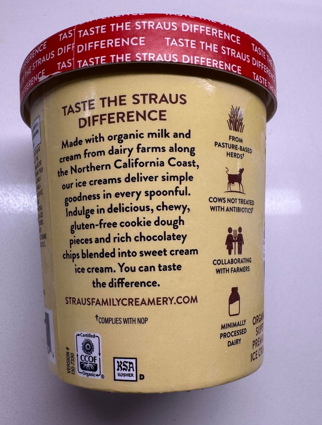 A sweet cream ice cream. Let it thaw a bit. Has flat chocolate chip pieces, like the type that would be in a boujee ice cream. Gluten-free cookie dough pieces don’t have chocolate chip pieces in them which I prefer. Cookie pieces are small and a bit gritty, A decent number of mix-ins – could use more. Picked up at Whole Foods for $7.99. Ever tried Straus?