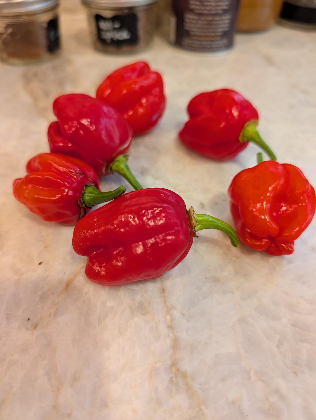 Second year attempting pepper from seed. First time getting a small harvest. Grown in 3-5 gal containers. Picked today. I ordered seeds from White Hot Peppers. Sold as scotch bonnet safi red, scotch bonnet beth boyd, and goat brains. Used the reds for a jerk wing marinade tonight. Pretty tasty.